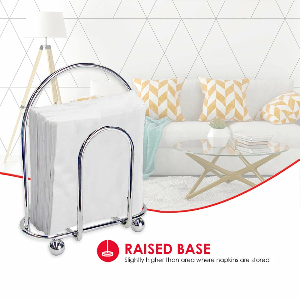 Simplicity. Elegance. Practicality- All come together in the form of this refined napkin holder Its simple silhouette and lustrous silver finish enhances the decor of your modern day table settings. The freestanding napkin holder is the perfect way to add a decorative touch to paper napkins, cocktail napkins, and cloth napkins. It holds a large stack upright so you can easily take one at time. The metal frame is formulated by two arches that hold napkins firmly in place on both sides, with the middle arch serving as an elegant and sturdy handle, for easy transport from location to another. For a napkin stand sturdy enough to use on a picnic table yet graceful enough to join the dining room table youโll enjoy this wire steel napkin stand.
