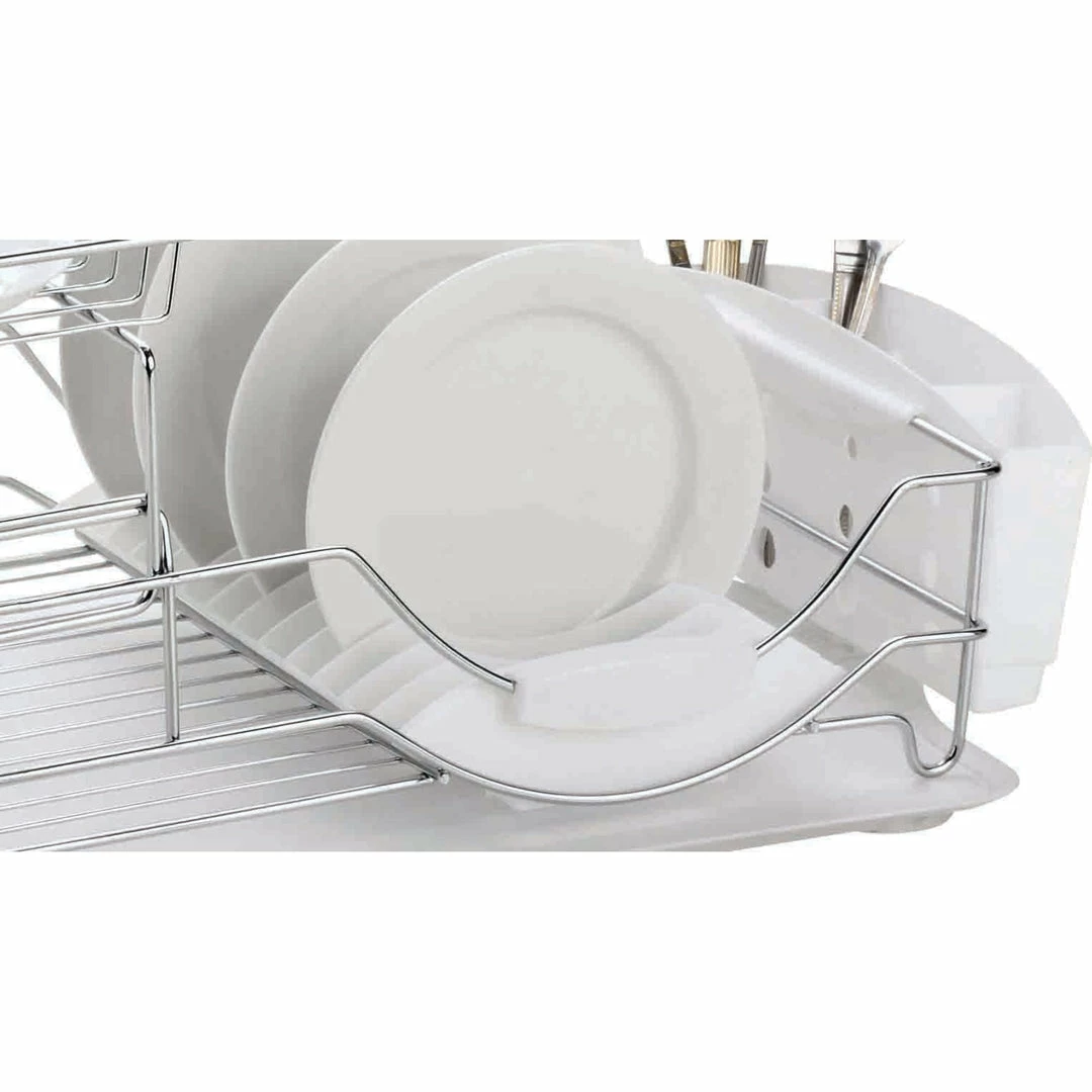 Bigger. Better. A place for everything. And Everything in its place. This deluxe dish drainer is fit to meet the demands of dishwashing duty. Its expansive design accommodates a large selection of cooking utensils and kitchen acccessories. To top it off, use the upper basket to display up to two medium sized bowls. Let your refine taste in style be known, by displaying your cherish china along the evenly space slots. Or stash silverware inside the removeable cutlery holder that features uniform perforations on the surface for efficient drying. Pull the ribbed plastic drip tray from underneath to capture and smoothly direct water into the sink to keep counters dry. Great for the sink or counter, this 3 piece deluxe drainer set makes airdying and stylisly displaying your dishware so simple and convenient.