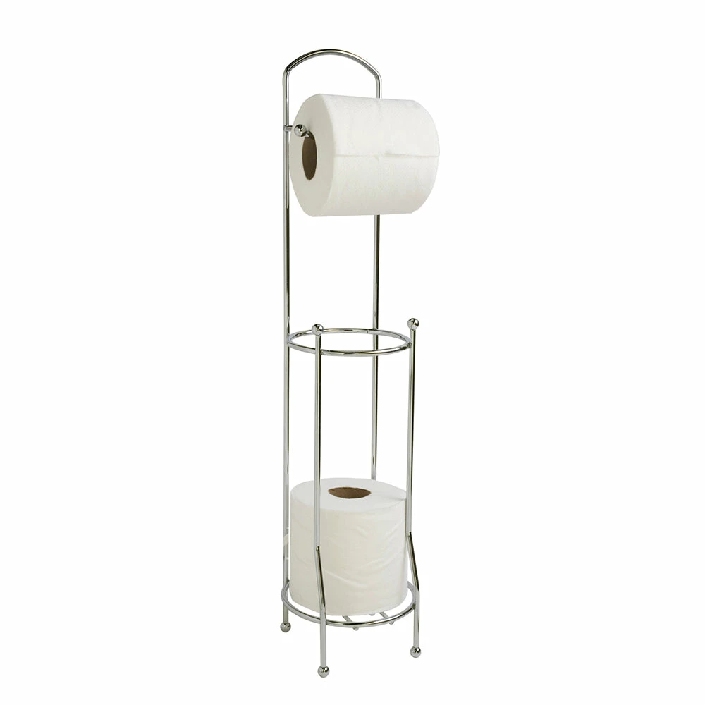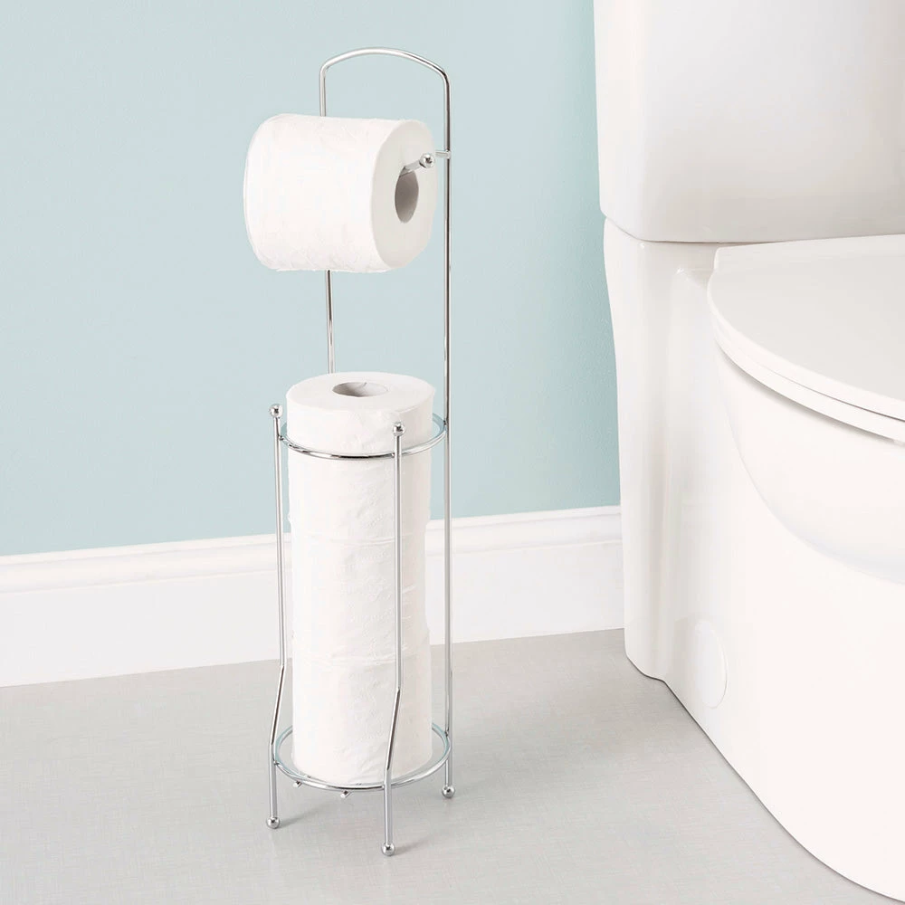 A toilet paper holder that won’t tip or topple, the heavy weighted freestanding bath tissue organizer offers durable storage for all your toilet paper rolls. It has a beautiful minimal design that doesn’t overpower your dรฉcor. With a sleek freestanding frame to allow for easy placement in any spot of the bathroom and the raised feet keep toilet paper slightly above the floor so it won’t get easily dirty. Store 3 additional rolls in the base and keep one handy at the top. The open arm allows you to easily replace a roll in a snap. Spot clean for easy maintenance. Props and accessories are not included.