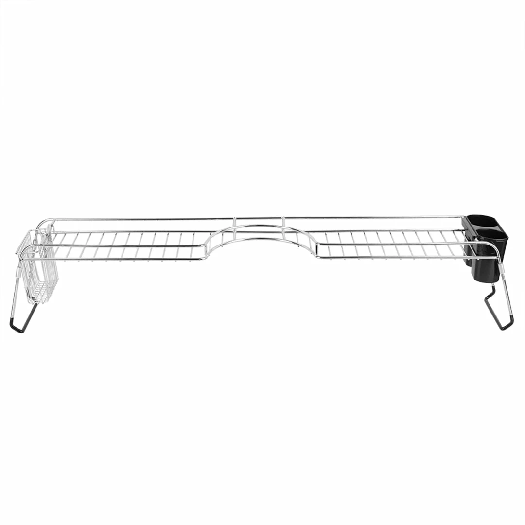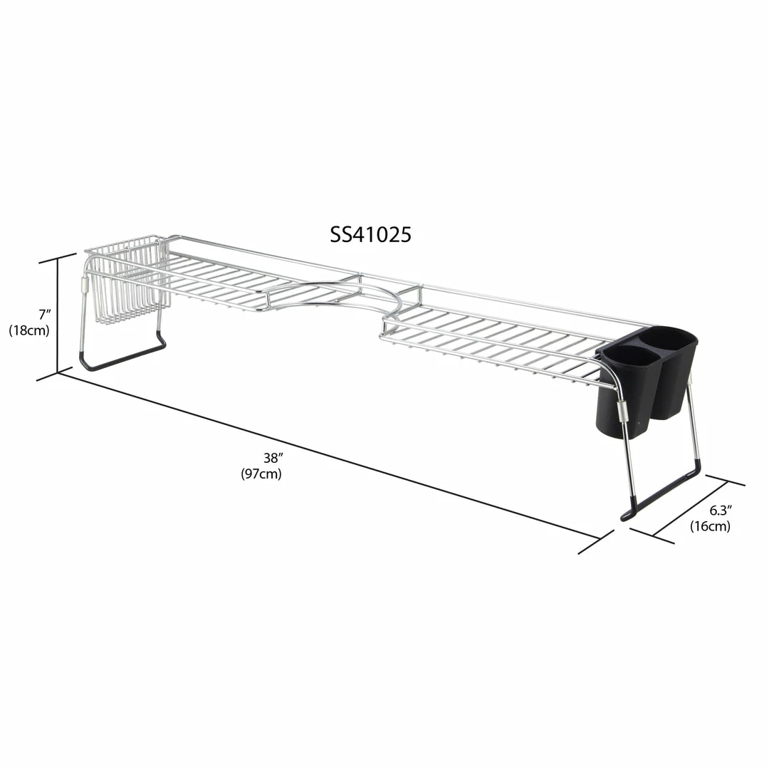 The area around your bathroom sink too cluttered? Looking for ways to get your counters clear so water can evaporate instead of becoming the breeding ground for bacteria or algae. Consider adding this sleek yet spacious organizer to provide clean and neat storage for your sink set up. The open, steel wire frame allows water and soap suds to freely pass through. It sized at the perfect sized to not hit that high rise faucet yet sleek enough not to crowd up the counter. Its wide surface provides a plethora of space for your soaps and sponges to dry out, extra room for draining dishware and silverware, and a beautiful gathering spot for those decorative elements and plants. Cutlery holder included. Item dimensions may differ slightly due to the unique nature of the product. Color and finish may also differ from the images shown due to differences in monitor displays. Props and accessories are not included.