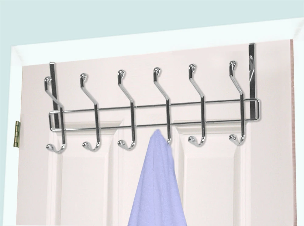 Hang and store Towels, coats, clothing, and other house hold items. Made from heavy duty chrome steel. Rust resistant. Hangs easily on any standard size door. Maximize your storage.