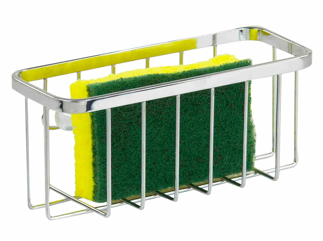 Store sponges and keep them in reach while cleaning with this sponge holder. The sponge holders comes equipped with two large suctions cups that stick securely over sink, tile or and non-porous surface such as metal, glass or porcelain. The open frame design allows water and soap suds to drain out preventing water from pooling over the countertop and residue build-up that you often find when constantly placing a damp sponge by the sink. While primarily used for a sponge, you can place a dish rag too. Constructed out of rust-resistant steel that helps it keep its structure. Short on space? No problem! Its compact and low profile, taking up minimal room in the kitchen. Item dimensions may differ slightly due to the unique nature of the product. Color and finish may also differ from the images shown due to differences in monitor displays. Props and accessories are not included.