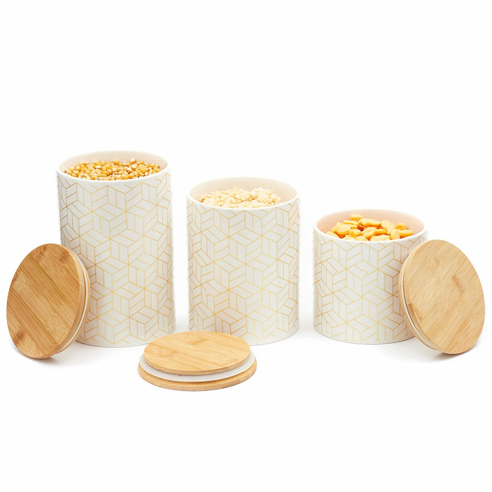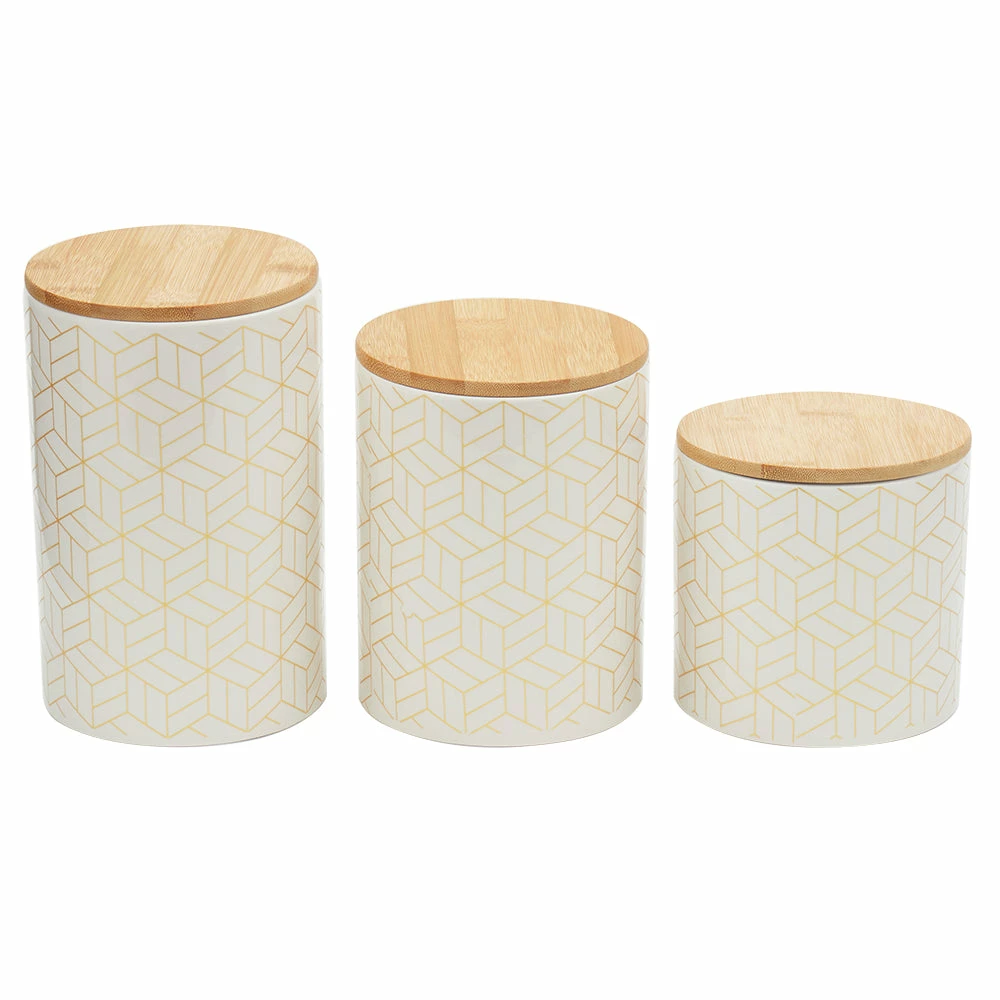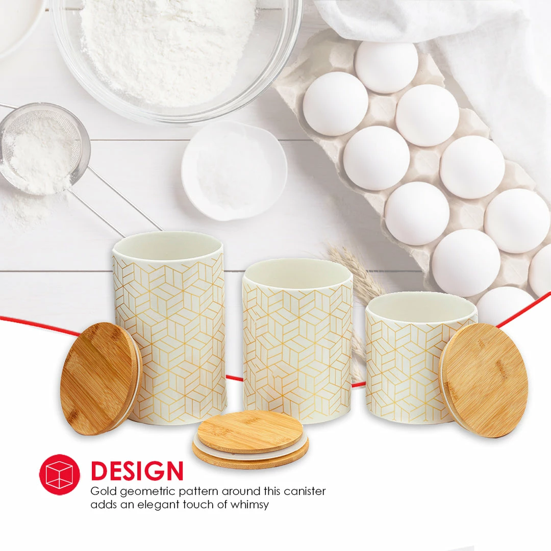 From pasta, flour, and spices, to tea and coffee keep all your favorite pantry staples fresh and flavorful with this set of canisters. The geometric cubix design is eye-appealing, while its smooth finish makes it easy to wipe clean. The lids are made from bamboo, with silicone seals underneath to preserve freshness and keep your contents secure. Show them off on the kitchen counter, or they can easily all fit in the pantry or cabinet. A must-have for any kitchen, they contrast any type of interior dรฉcor. Use not only for storing food, but to place makeup, cue tips, stationary, jewelry, and more. Hand wash to clean. Item dimensions may differ slightly due to the unique nature of the product. Color and finish may also differ from the images shown due to differences in monitor displays. Props and accessories are not included.