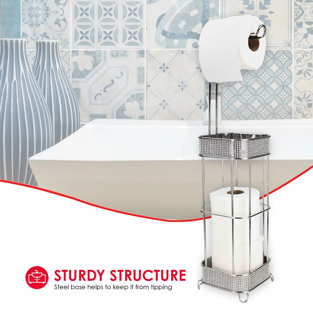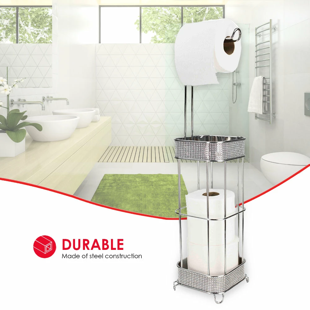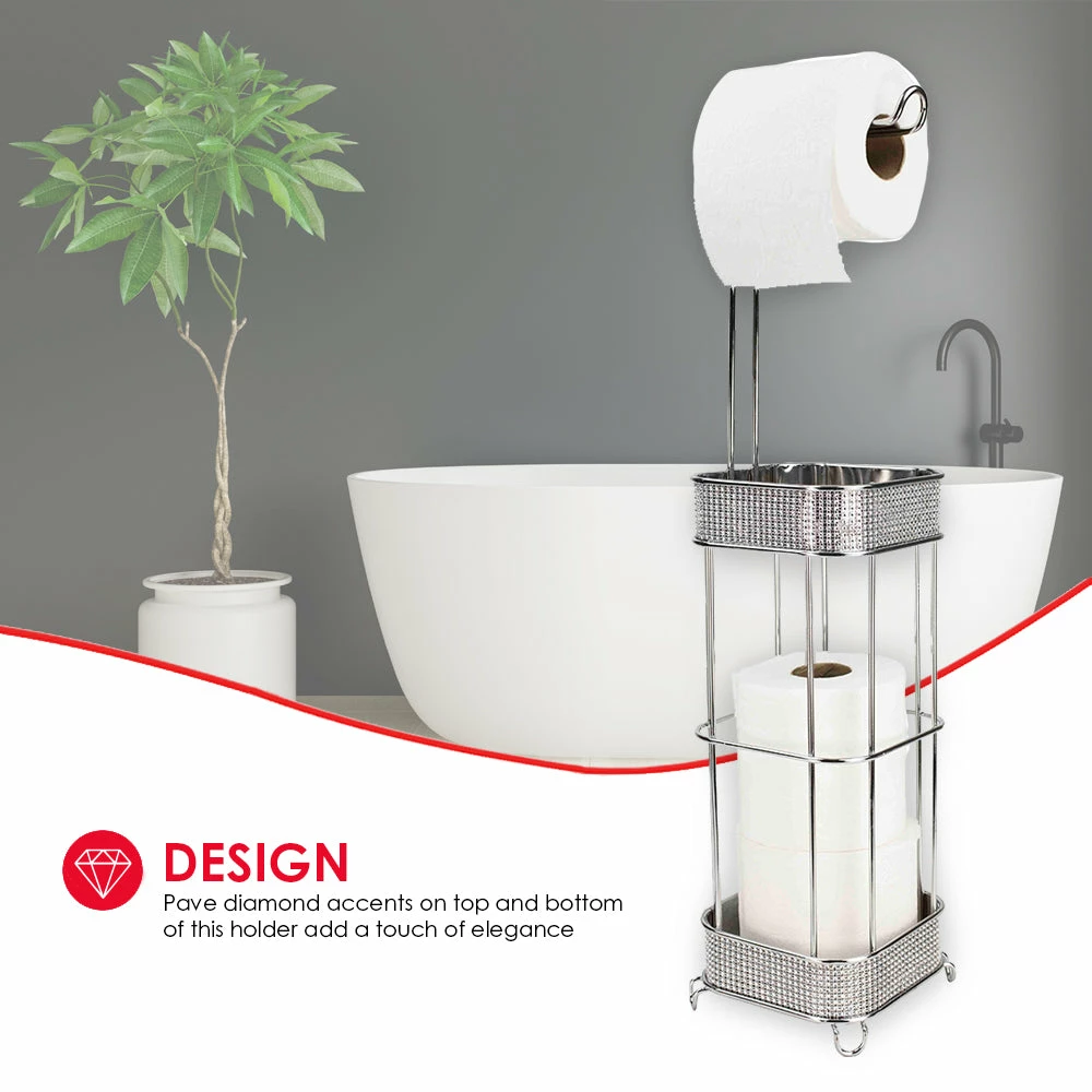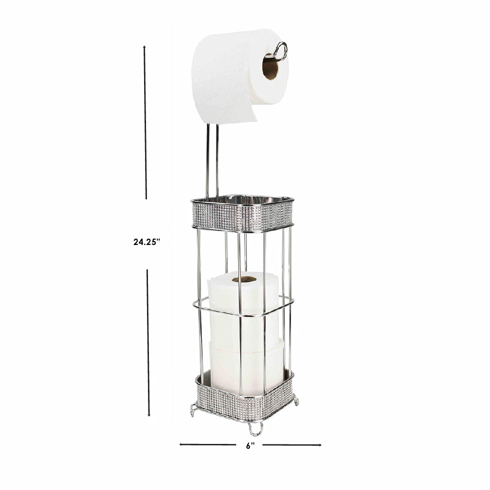 Refined elegance and timeless sophistication will permeate the room as soon you display this gracefully style bath tissue dispenser, that decoratively corrals up to 3 spares rolls and dispenses a single paper towel roll on the top. Accented with gleaming faux crystal that lend an elegant touch it will transform even the most bland and bare bathroom into a luxurious oasis. From the powder room to the master bathroom, with its lightweight design, you can easily lift it and place it wherever you choose to radiate a glamorous ambiance that will wow your guests every time they set their sights on it.