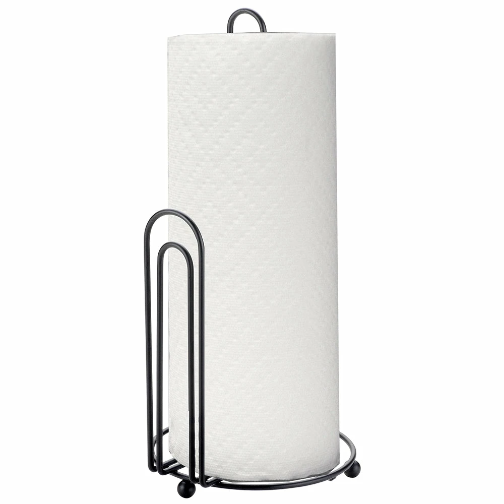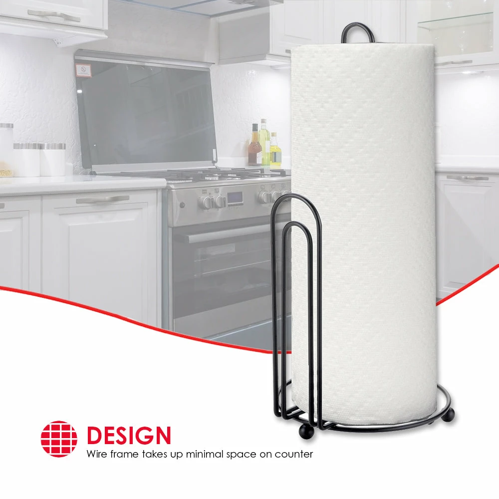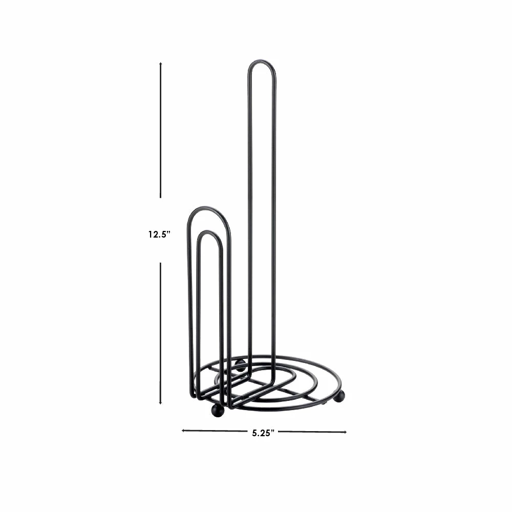 Keep paper towels close at hand, while adding modern elegance to your kitchen countertop with this free-standing minimalist styled paper towel holder. Constructed of durable steel to keep it steadily in place, yet light enough to easily move around should you need to clean the counter. No need to unscrew annoying finials to replace a roll, simply slide it on the metal loop to fill or slide it off to remove. Weave the paper towel along the double metal loop in the front of the paper towel holder. Then pull and tear the amount of paper towels you need. The base is equipped with non-skid feet to secure it in place, so you can be assured that the paper towel holder does unravel in the process. (Paper Towel roll not included).