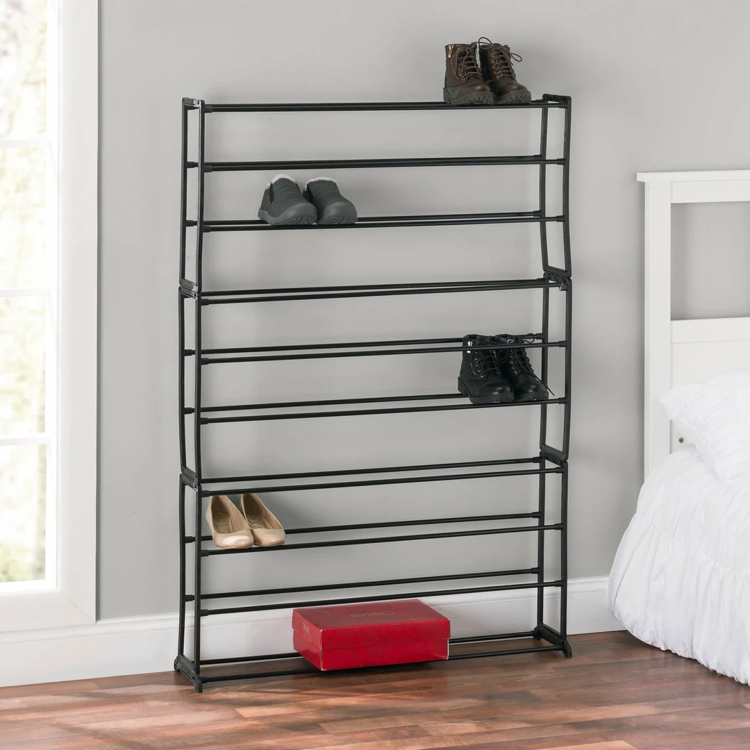 Enjoy Clutter-free floors while bringing a classic modern touch with this shoe rack. This multi-level shoe organizer features a metal frame with matte midnight finish to coordinate with a variety of spaces. Open shelves make it easy to find the pair of shoes you need , while also promoting air flow to limit the amount of unpleasant odors that can emit from used shoes. Whether you’re looking to ensure those posh pumps don’t become Fido’s afternoon snack or looking to ensure your teen’s tennis shoes are no scattered