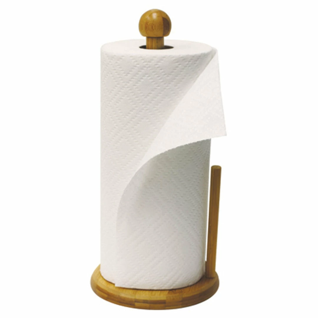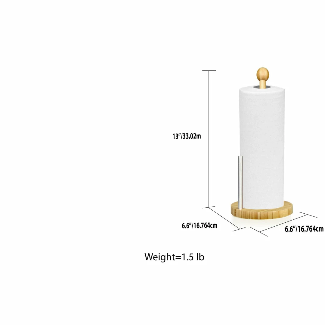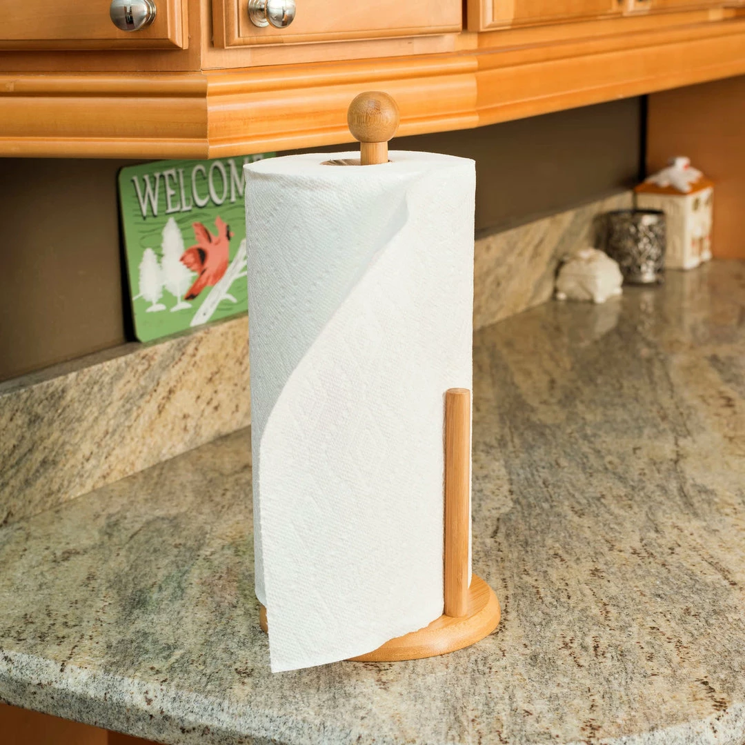 Keep your paper towels close at hand with this free-standing bamboo towel holder. Simply slip a paper towel roll on the center post to reload. The base is heavy and well balanced to prevent it from toppling over when tearing off a paper towel sheet or tipping over when placed outside on a windy day. It fears a side dowel to make it easy to rip a single sheet. The natural finish is a lovely complement to any kitchen dรฉcor. The simple design looks great paired with other bamboo accessories or appliances. Unlike mounted paper towel holder, With its free standing design you have the flexibility of placing it wherever you design. Leave it out on the kitchen countertop, table, vanity or kitchen island or bar cart– it’s up to you!
