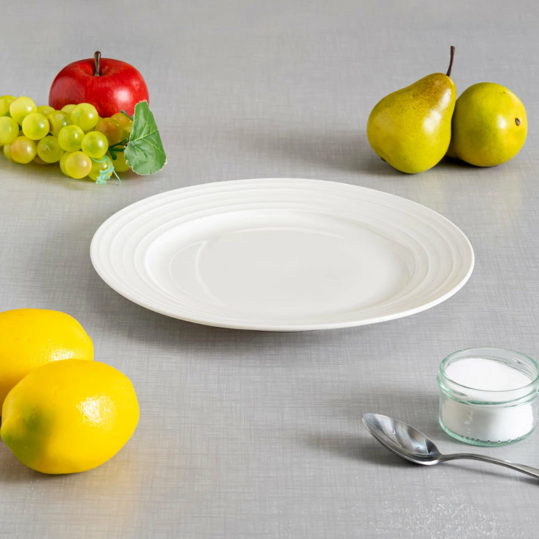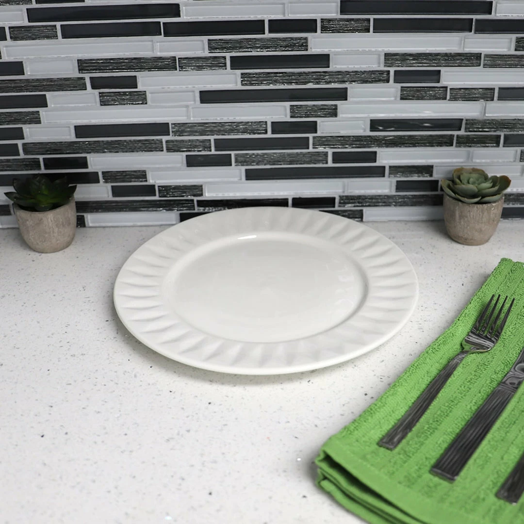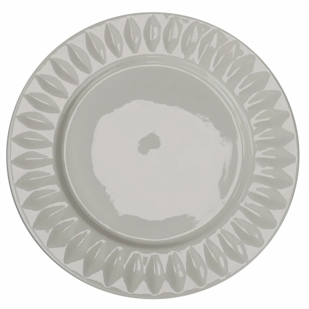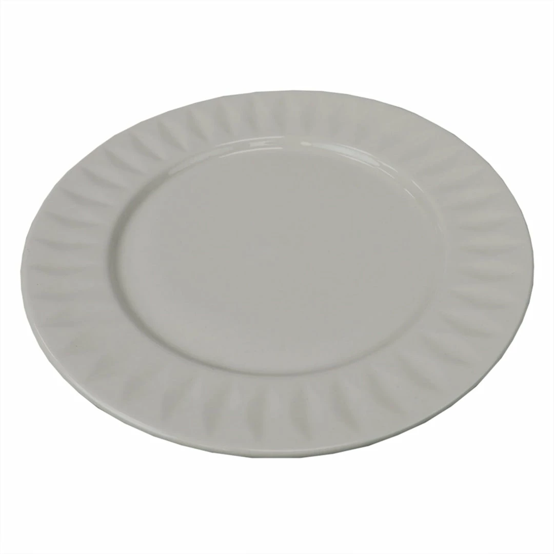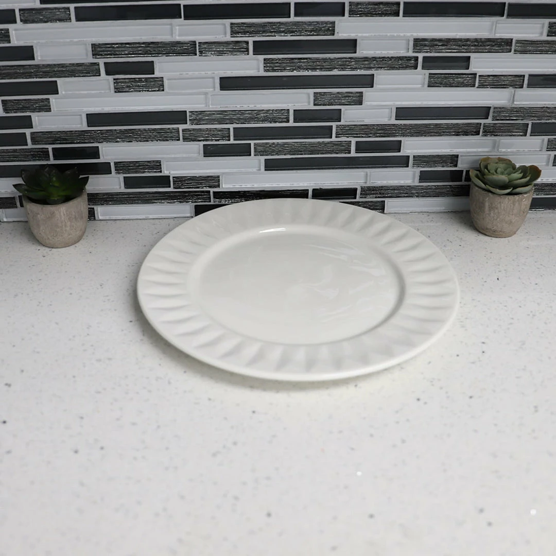 Give your kitchen set up a little luxe with this re finely elegant embossed dinner plate. Embossed circle pattern provides an elegant background for everyday meals to special occasions. Thick ceramic makes it last for years to come. Round shape makes it easy to stack to conserve space. Hand wash.