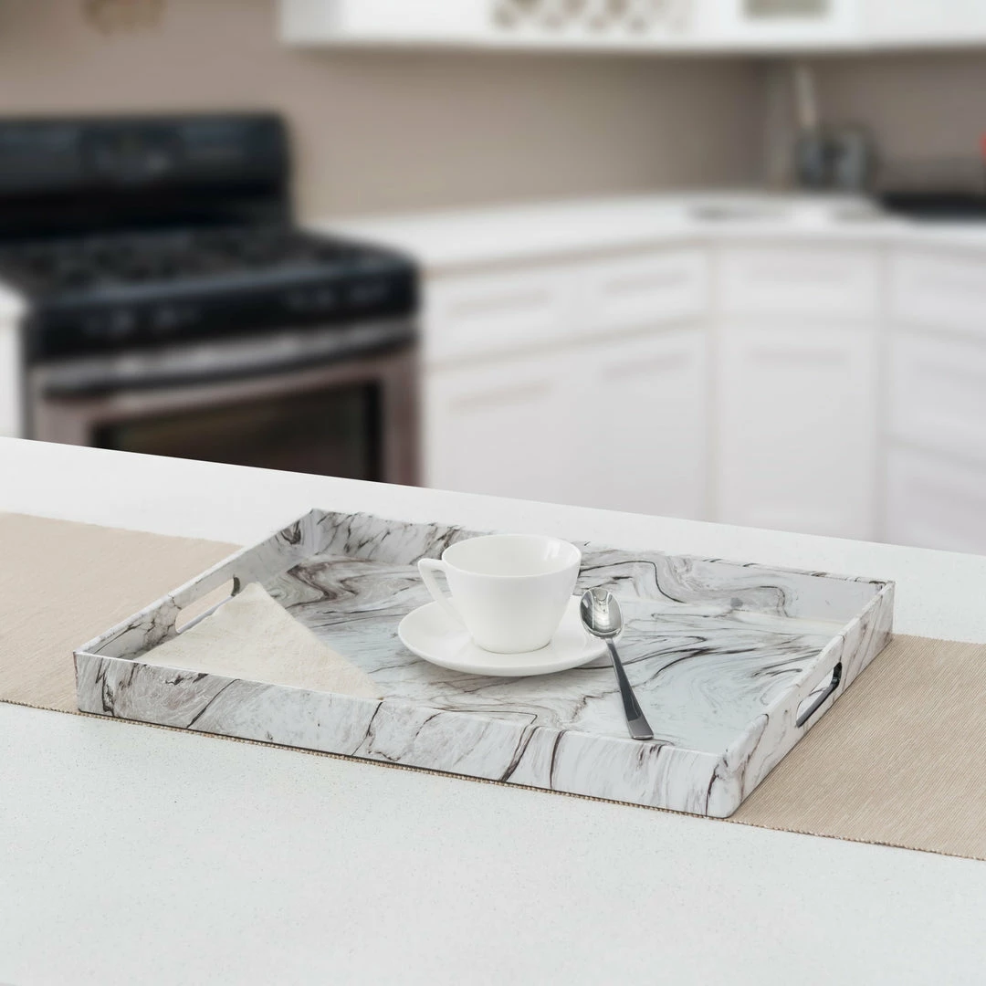 Step up your entertaining set up with a regal touch by serving a delicious spread of appetizers and desserts with this chic serving tray. Designed with striking veining it gives off the look of marble without the heft. Cut out handles on each end and a spacious rectangular surface, make it a breeze to carry this tray wherever you need in one single trip. While perfect for special occasions, this versatile decorative vanity tray provides an elegant backdrop for scented candles, decorative jars, jewelry and other odds and ends. Take your dรฉcor up a notch by matching this piece with our faux marble bath accessories and storage solutions for a cohesive look. Or give it as a charming gift for your friends or family.