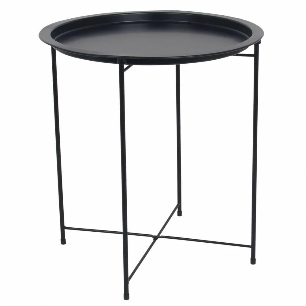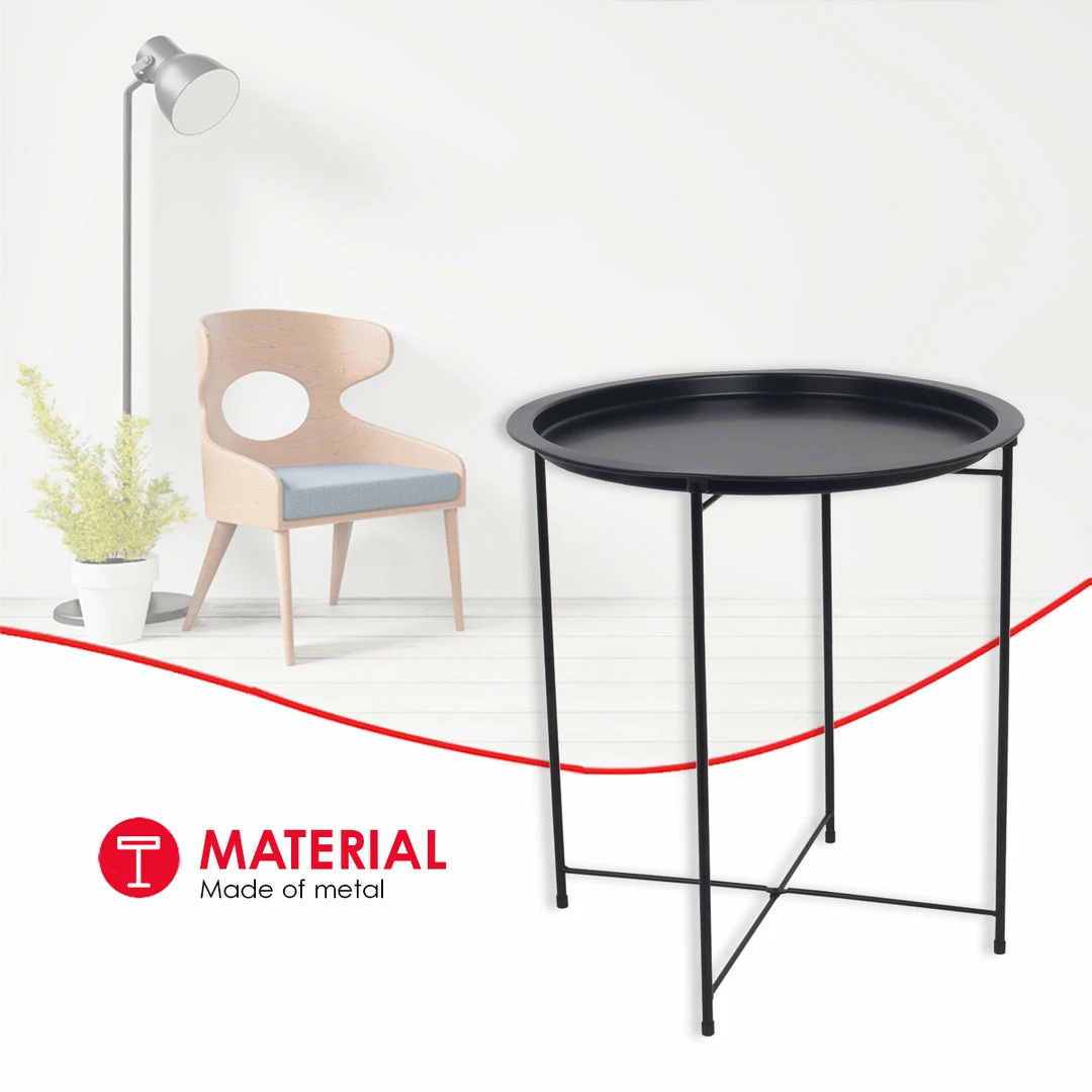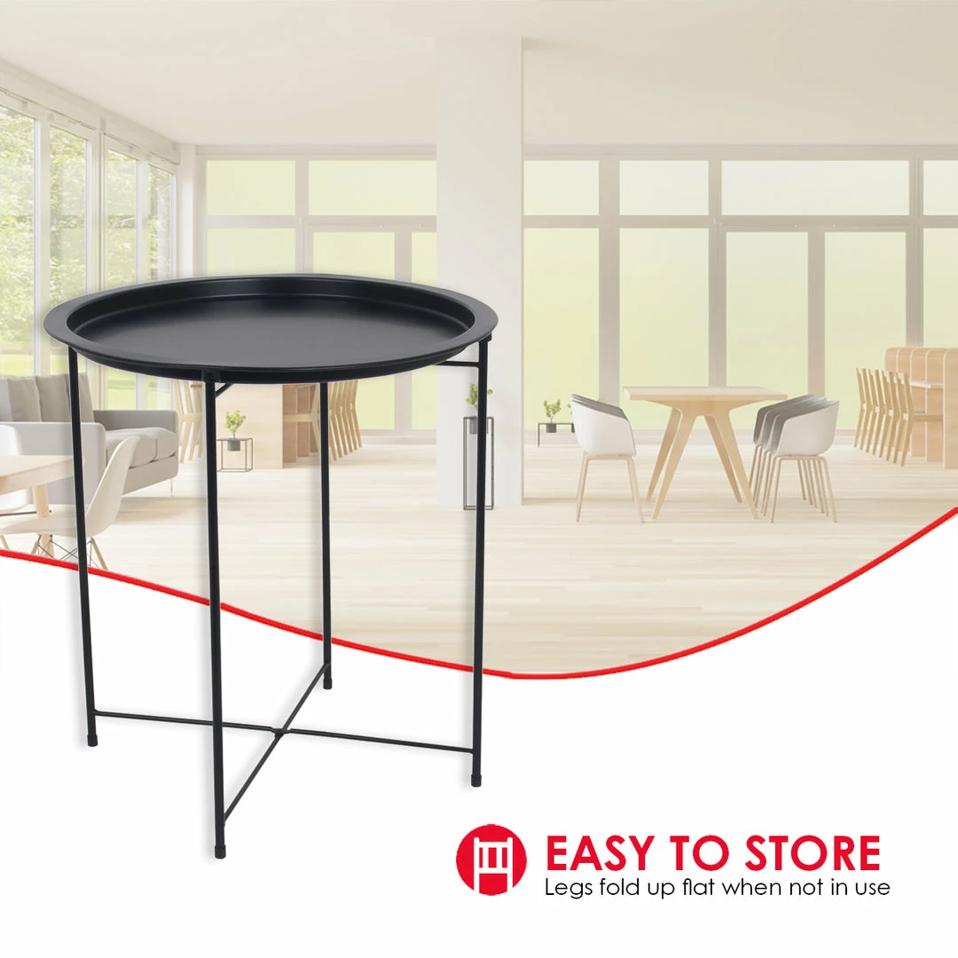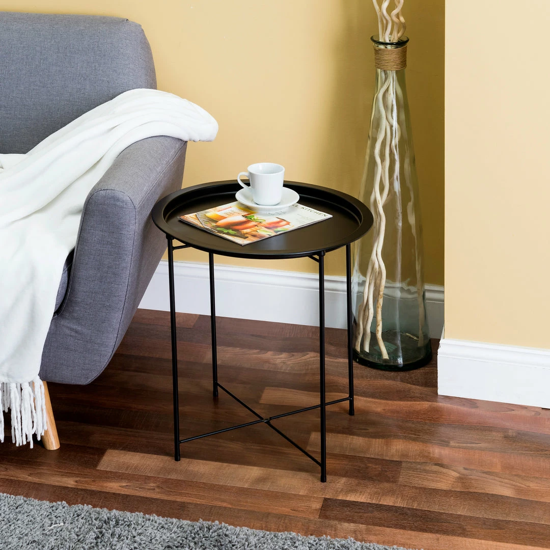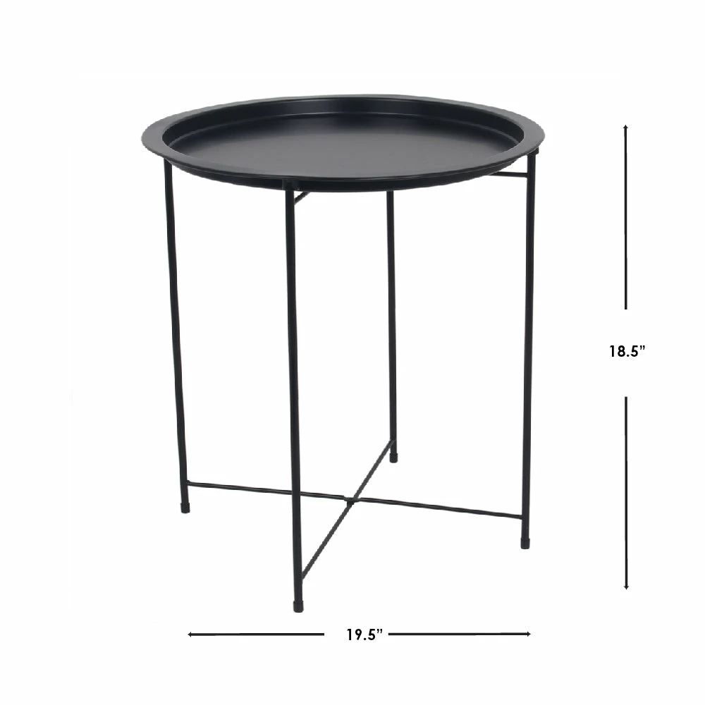 - Doubles as a circular end table, night stand, accent coffee table, snack table, collapsible metal tray table