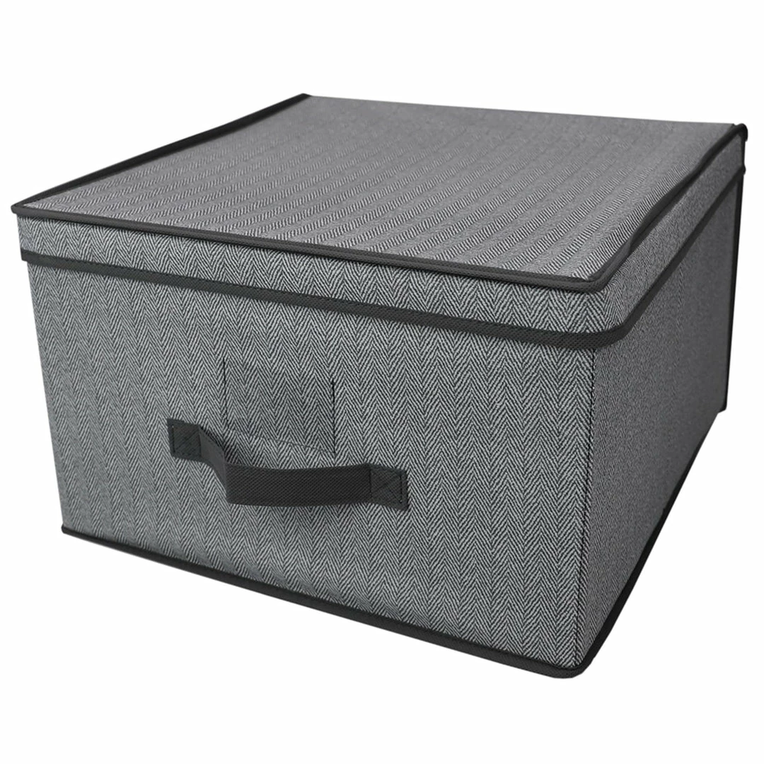 Ditch those plain and boring storage bins and upgrade with this fashionable open storage tote. Made of breathable non-woven fabric, it features an eye-catching herringbone pattern. With firm and rigid sides, it maintains its shape for years to come. Sturdy nylon handle for easily pulling from a top shelf and sliding out from a cubby organizer. Collapsible for maximizing space with a clear window for classifying storage.