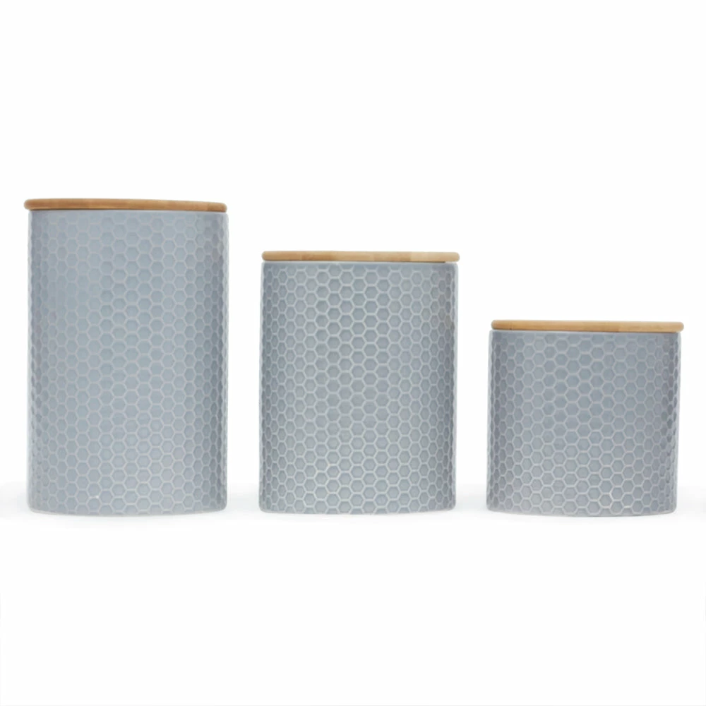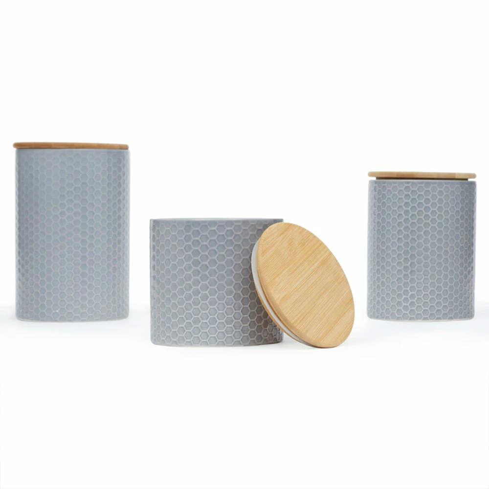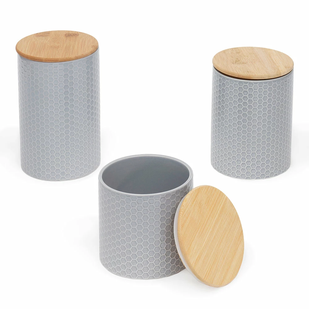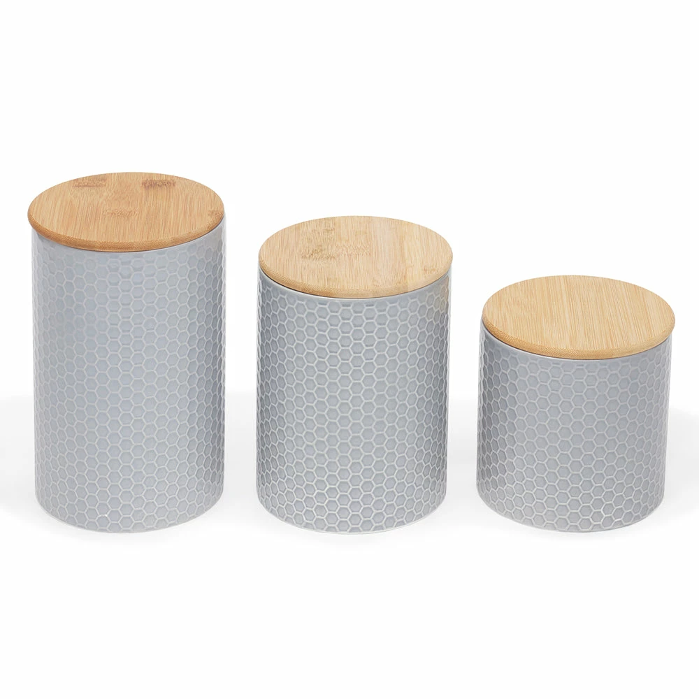 From pasta, flour, and spices, to tea and coffee keep all your favorite pantry staples fresh and flavorful with this set of canisters. The geometric honeycomb design adds a touch of texture while its smooth finish makes it easy to wipe clean. The lids are made from bamboo, with silicone seals underneath to preserve freshness and keep your contents secure. Show them off on the kitchen counter, or they can easily all fit in the pantry or cabinet. A must-have for any kitchen, it matches any type of interior dรฉcor. Use not only for storing food, but to place makeup, cue tips, stationary, jewelry, and more. Hand wash to clean. Item dimensions may differ slightly due to the unique nature of the product. Color and finish may also differ from the images shown due to differences in monitor displays. Props and accessories are not included.