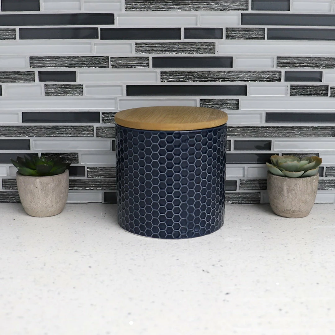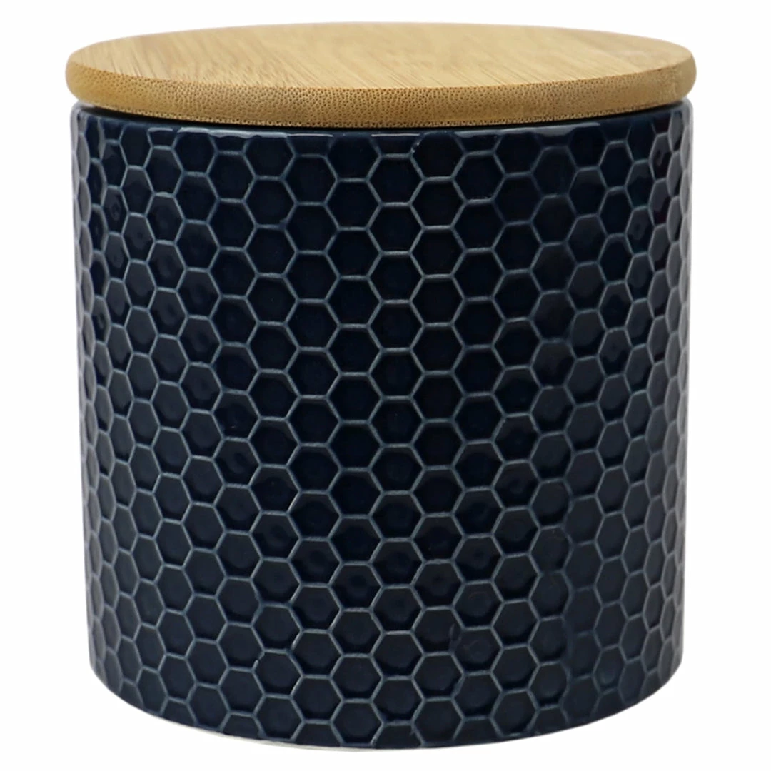 From pasta, flour, and spices to tea and coffee keep all your favorite pantry staples fresh and flavorful with this honeycomb patterned ceramic canister with bamboo lid. The raised honey comb design adds a touch of texture while its smooth finish makes it easy to wipe clean. The silicone ring keeps air out, creating an air-tight environment to keep contents dry and free insects. A must-have for any kitchen, it matches any type of interior dรฉcor. Hand wash.
