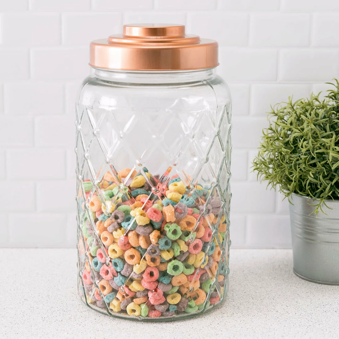 A nice change up from those clear and silver colored jars, it provides a roomy spot for all your dry foods, while adding an inviting warm glean with its stunning copper top. Use it to provide stylish storage for spaghetti, trail mix, cookies, flour and more. No more worrying about your food becoming stale! It features an air-tight lid that seals in all the contents inside. The glass construction is heavy duty preventing it from easily breaking. The base is clear to make it easy to know when itโs time for a refill without lifting the lid. Beautifully decorated with ornate, etched detailing itโs perfect if youโre looking for a textural storage piece to complete the room. The top is made of sturdy steel and finished in a gleaming copper color that lends a sophisticated look to the countertop. As robust as it is elegant, itโs great to prevent cabinet clutter, while adding a stylish touch to your space.
