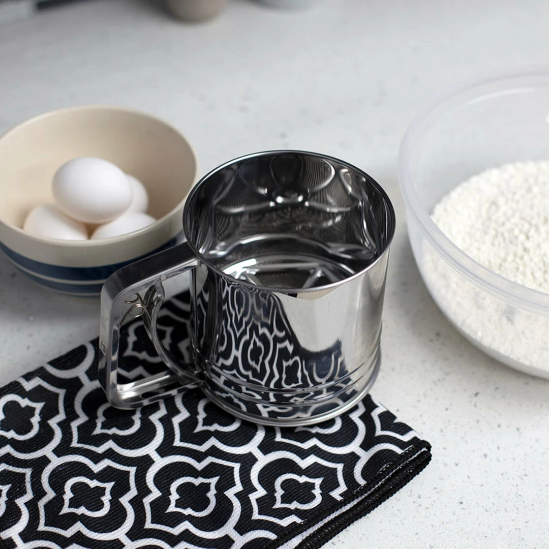 A classic and handy hand-held flour sifter, for all your baking needs whether itβs a light sprinkling of powder sugar on your desserts or dusting your work surface with a dash of flour. This manual sifter gives you the best results thanks to its fine mesh bottom that both sifts both fine and course ingredients ranging from cocoa, sugar, powdered spices and herbs and more. Fill it with whatever you desire and squeeze the handle and ingredients will sieve without any clumps.