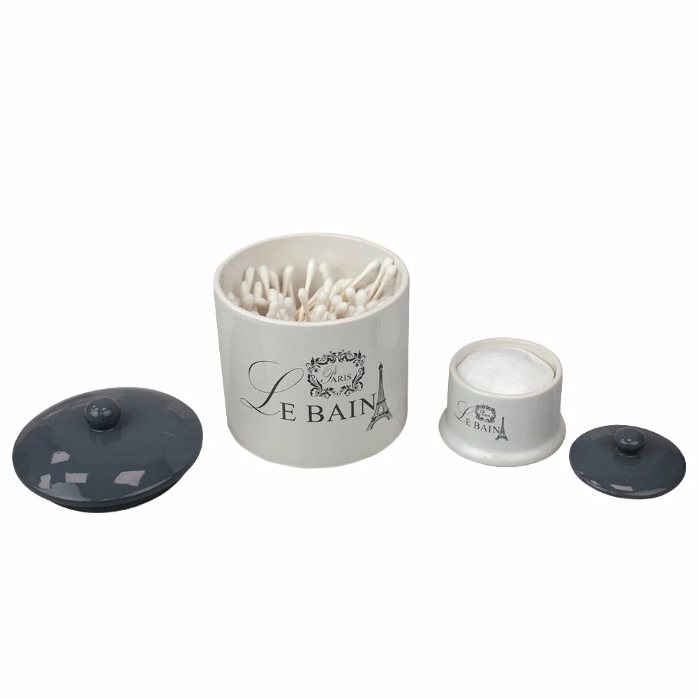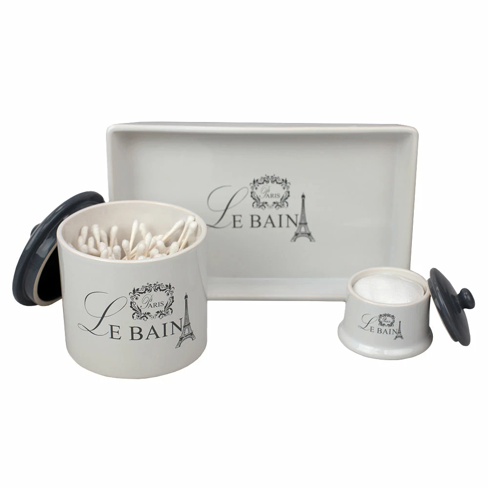 Refresh your bathroom with a touch of Old World Parisian charm using this set of canisters with coordinating vanity tray. This handy canisters are great at keeping cosmetics, cosmetic pads, jewelry and other small toiletries and bath accessories neatly organized. Place on top of the vanity in the bathroom or dress up your bedroom dresser. It comes complete with a vanity to keep everything in place. Spot clean. For easy maintenance, simply gently wash the set with mild soap and water. Item dimensions may differ slightly form actual product due to manual measurement. Color and finish may also differ slightly from image due to differences in monitor displays. Props and accessories not included.