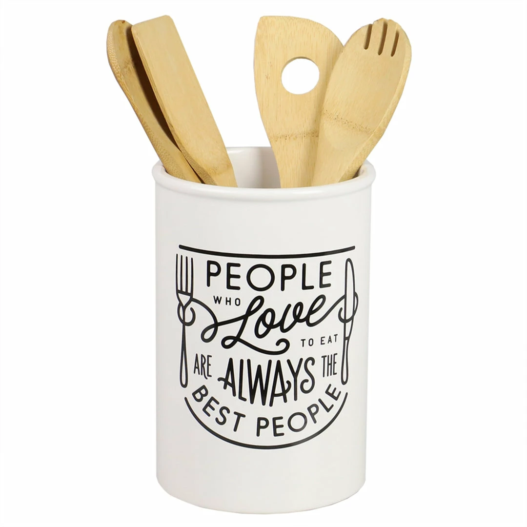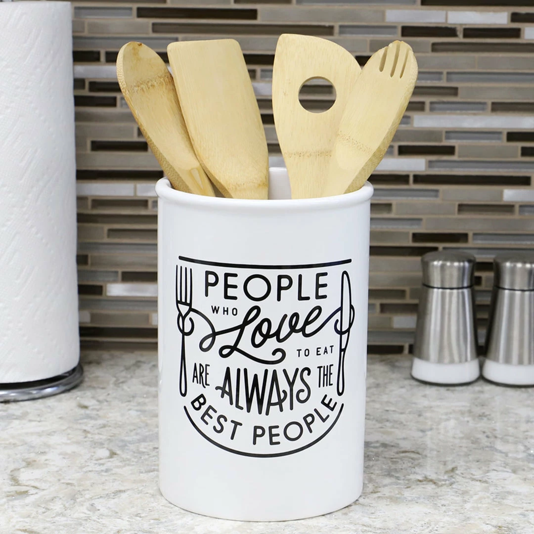 If you enjoy great food and great people to share it with this ceramic utensil crock is perfect for you. This utensil crock keeps your everyday cutlery and frequently used cooking tools right at your fingertips, while complementing many interior décor styles. Equally at home in a contemporary, country, or vintage kitchen. A heavy weighted base keeps everything in place. Fill the spacious interior with your cooking spoons, whisks, spatulas, and ladles. It’s generously sized keeping a whole bunch utensils handy and at the ready for your next recipe. Place on top of your countertop or near your stovetop, so you can grab the tool you need instead of rummaging through a crowded drawer. Hand wash with warm water and use gentle soap. Dry thoroughly. Item dimensions may differ slightly due to the unique nature of the product. Color and finish may also differ from the images shown due to differences in monitor displays. Props and accessories are not included.