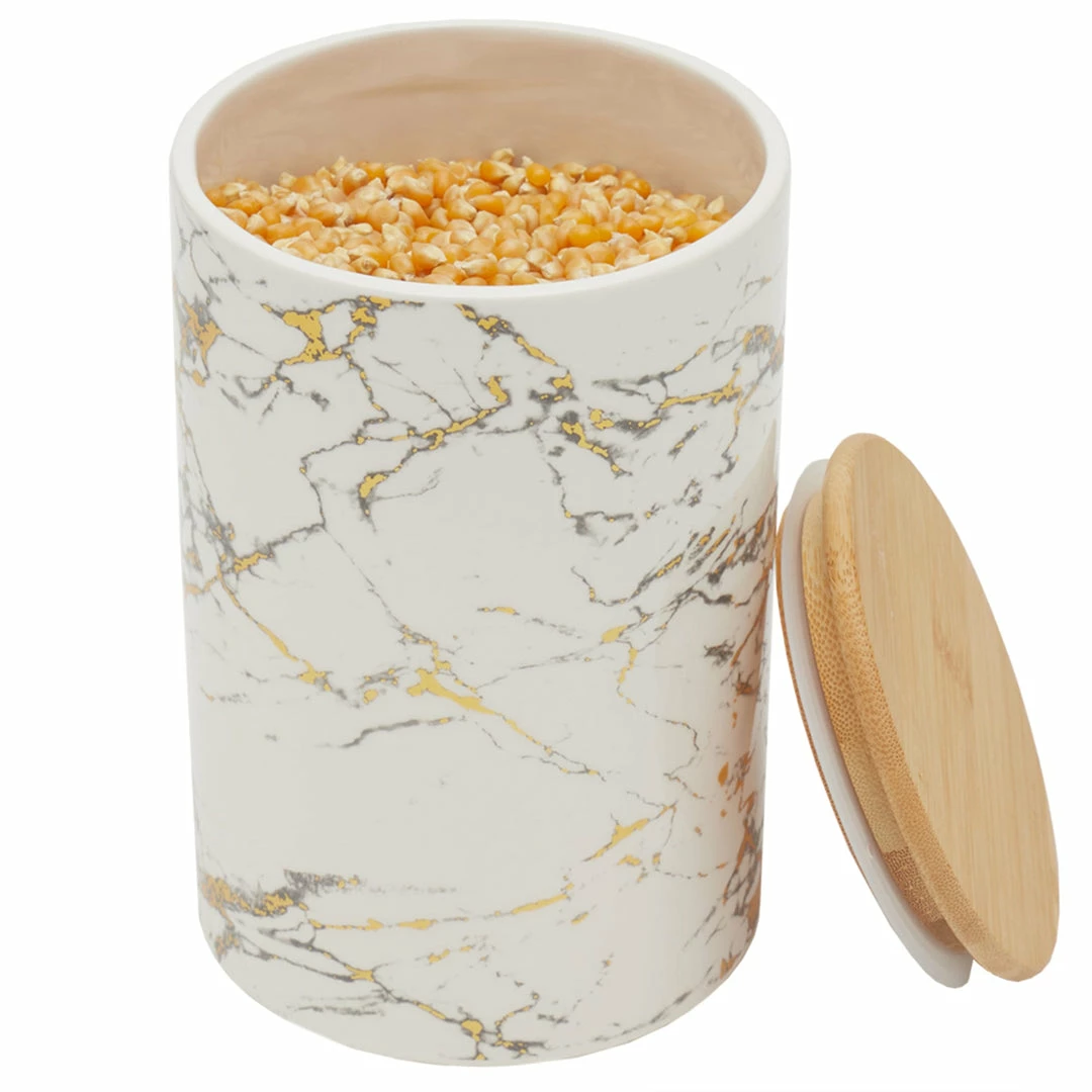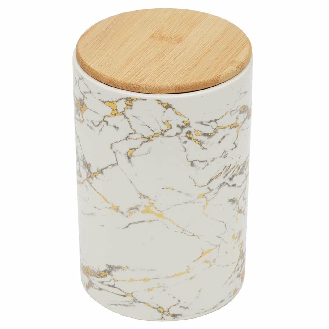 Preserve and store all your favorite dried foods longer. Great for coffee beans, sugar, salt and pepper. Topped with a bamboo lid that lift off for ease of use. No difficult latches or clasp to have to unlock, making it super easy to get what you need when youโre in a hurry. Great as decorative container. Display on the countertop, dresser, or table. Use during the holidays as seasonal countertop dรฉcor. Place on vanities and shelves for even more stylish bath storage. With its beautiful design it will add visual appeal to any setting and also help hide any clutter. Great as gift for friends and family. Store in a dry environment. Wipe the surface with a clean cloth. Item dimensions may differ slightly due to the unique nature of the product. Color and finish may also differ form the images shown due to differences in monitor displays. Props and accessories are not included.