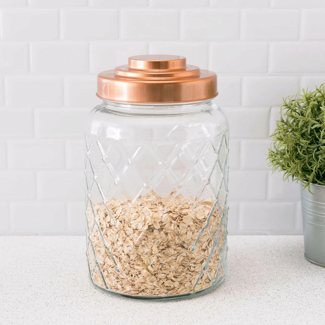 A nice change up from those the clear and silver colored jars it provides a roomy spot for all your dry foods, while add an inviting warm glean with its stunning copper top. Use it to provide stylish storage for spaghetti, trail mix, cookies, flour and more. No more worrying about your food becoming stale! It features an air-tight lid that seals in all the contents inside. The glass construction is heavy duty preventing it from easily breaking. The base is clear to make it easy to know when it’s time for a refill without lifting the lid. Beautifully decorated with ornate, etched detailing it’s perfect if you’re looking for a textural storage piece to complete the room. The top is made of sturdy steel and finished in a gleaming copper color that lends a sophisticated look to the countertop. As robust as it is elegant, it’s great to prevent cabinet clutter, while adding a stylish touch to your space.
