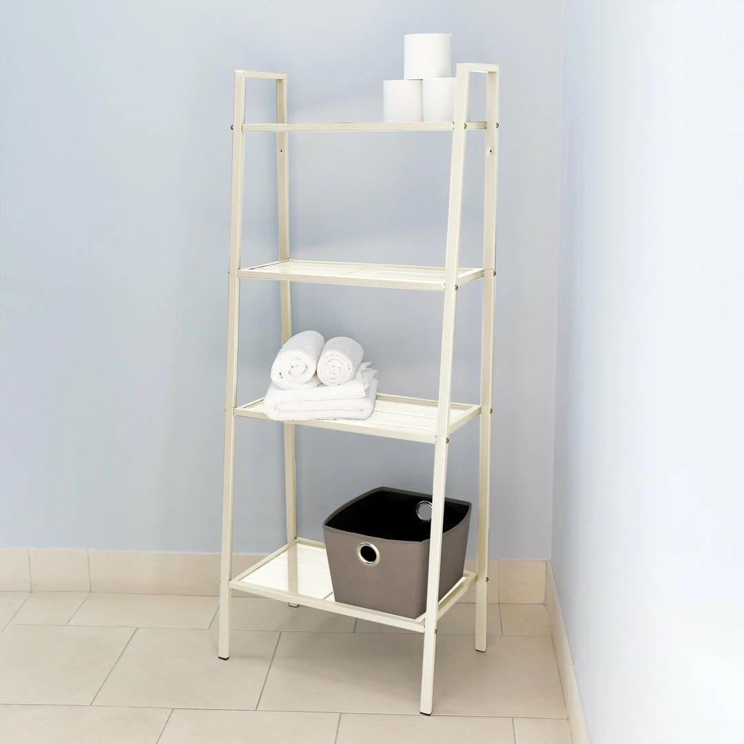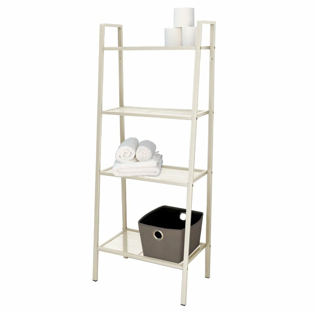 Defined by a simple design, this freestanding metal rack brings convenient compact storage in small spaces while providing ample space for all your belongings. Use as a storage rack for housing toiletries, books, plants. The total weight capacity for the entire unit is 61 pounds. The top shelf can hold 6 pounds/3 kilograms, the second 11 pounds/5 kilograms, while the last two shelves hold up to 22 pounds/10 kilograms. Item dimensions may differ slightly due to the unique nature of the product. Color and finish may also differ from the images shown due to differences in monitor displays. Props and accessories are not included.