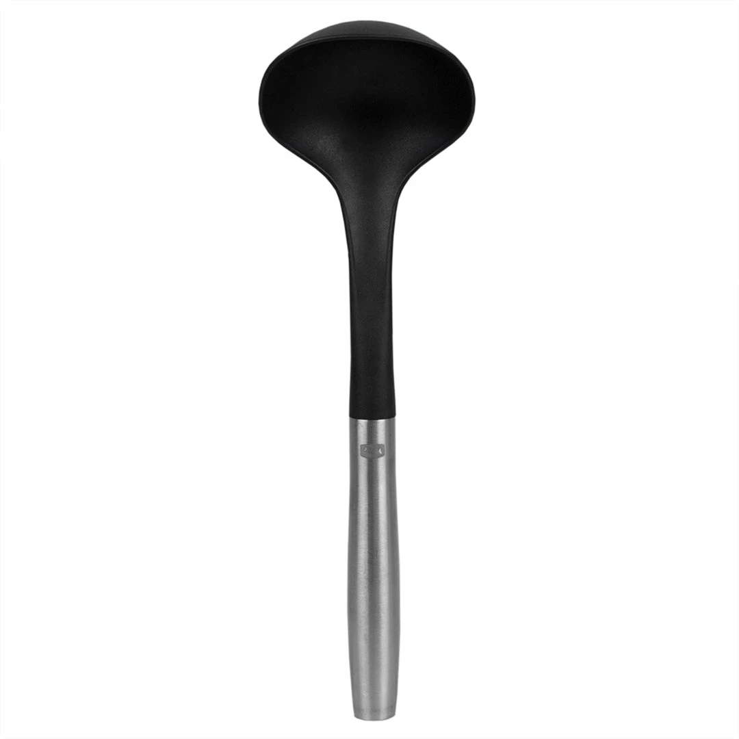 From cooking hot batch of stew to serving up holiday punch, this scratch-resistant ladle features a nylon head that is as robust as a steel but is safe to enough to use on non-stick, glass and enamel coated cookware. The smooth stainless steel handle is substantially built and fits comfortable in your hand to take the strain from frequent stirring. Its deep bowl makes it great for scooping every ounce to feed a crowd. A convenient hanging hole located along the end of the handle to store away when not in use.