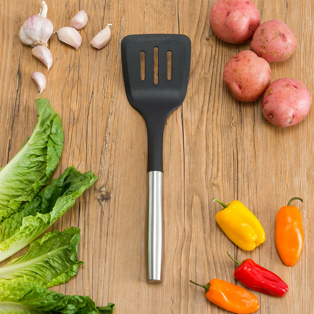 From lifting sticky, homemade cookies from a cookie sheet to mixing cake batter, this scratch-resistant slotted turner features a nylon head that is as robust as a standard steel turner but is to safe enough to use on non-stick, glass and enamel coated cookware. The nylon blade is firm enough to turn over delicate filets of meat and fish without breaking in the process yet flexible and soft to spread frosting on cakes to scraping out mixing bowls. The smooth stainless steel handle is substantially built and fits comfortable in your hand to take the strain from frequent turning.