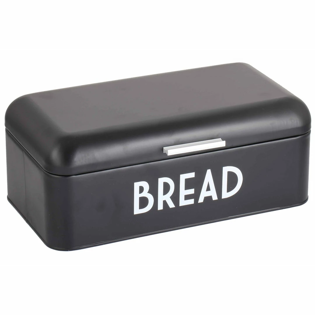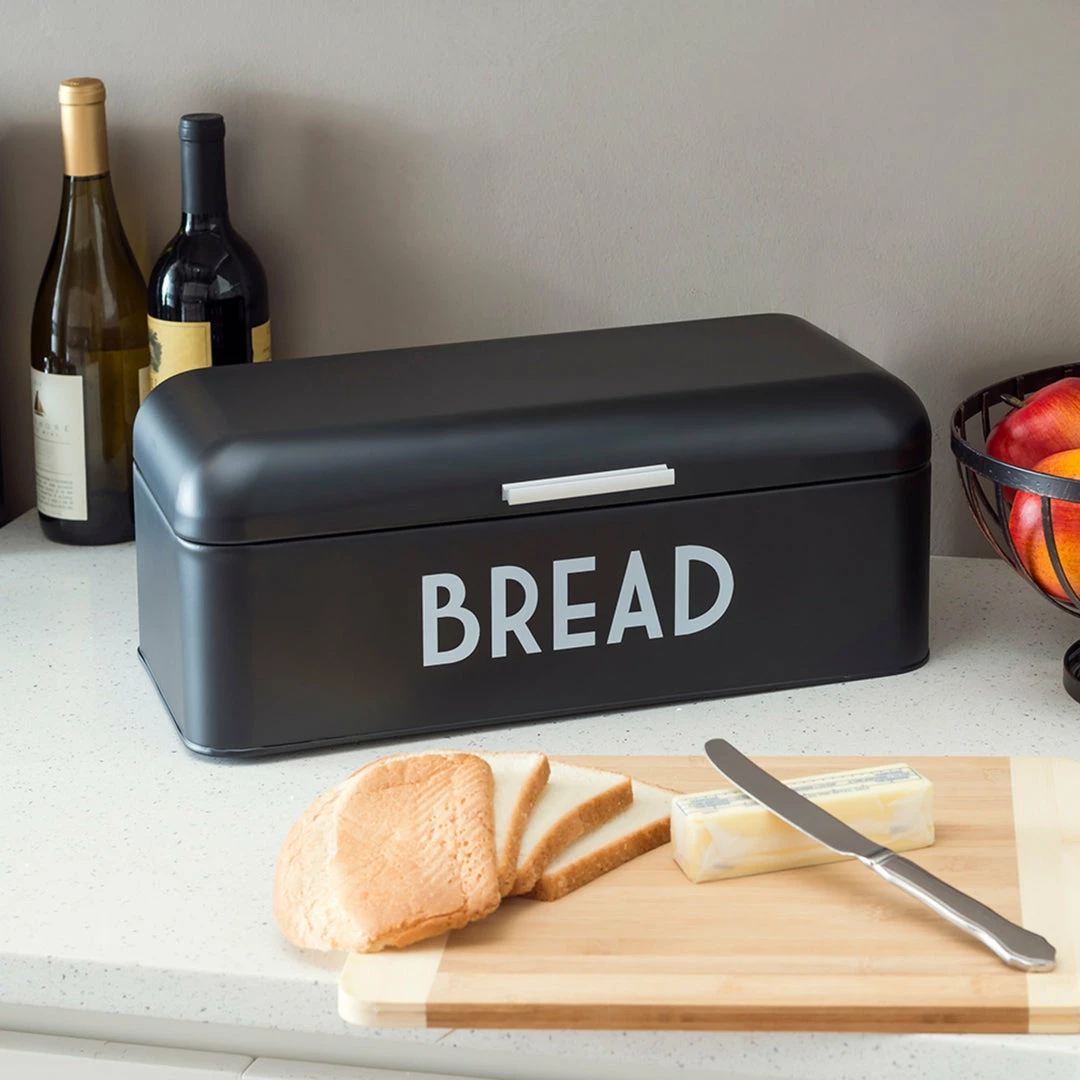 Conveniently store baked goods and fresh bread neatly in this Home Basics Bread Box. Made from durable powder coated steel, the words “Bread” are printed atop an enchanting black hue. With a roll up lid and sturdy handle, putting away and grabbing a loaf of bread or baked snack is a snap. Turn your kitchen into a retro retreat with this vintage styled bread box.