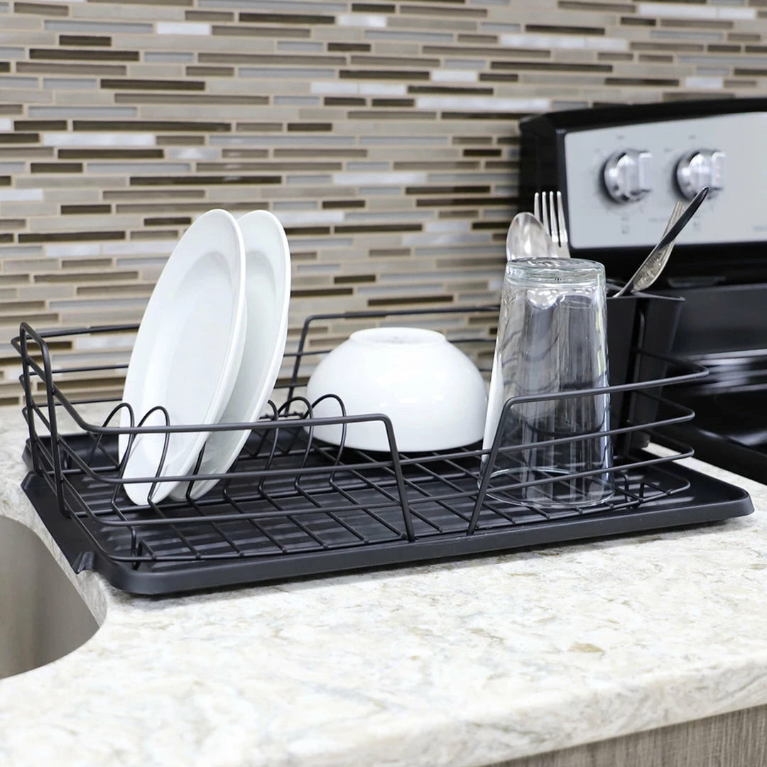 Upgrade your kitchen set up with the Deluxe Dish rack with Removable Dual Compartment Utensil holder. The rack features multiple slots for drying full size dinner plates with a convenient sectioned utensil caddy for keeping knives, forks, or spoons separated. Remove the utensil holder on the right or left side of the dish rack. Itโs completely up to you. The utensil holder can be removed and fits on either side of the rack giving you plenty of placement options to accommodate your space or for quickly hand washing the unit when you need it. Sized just perfectly to prop on top of a countertop or lay inside most sinks, it features a plastic drain board for catching drips and spills so you can spend less time cleaning a wet counter top from washing dishes. Each piece can be separated making it a cinch to clean. To clean the unit, simply hand wash with warm water, and use mild soap. Dry thoroughly after use. Item dimensions may differ slightly from the actual product due to the unique nature of the product and manual measuring. Color and finish may also differ slightly from the image shown due to differences in monitor displays. Props and accessories are not included.