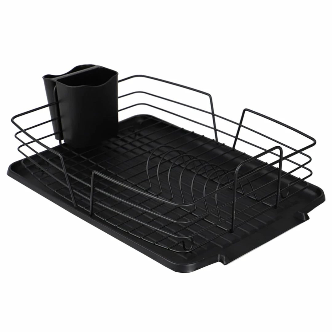 - Compact single tier dish rack with drain board and sectioned utensil holder great for small apartments, condos, studios or wherever space is limited