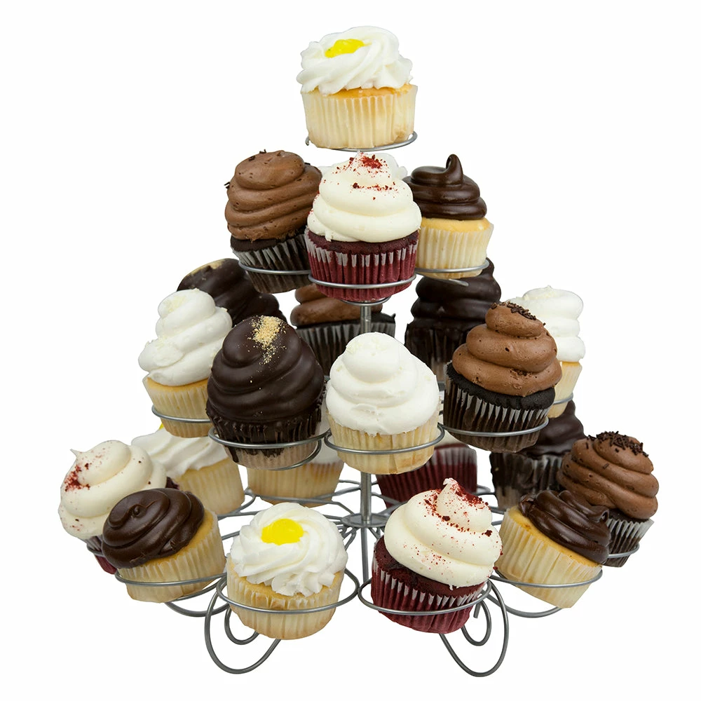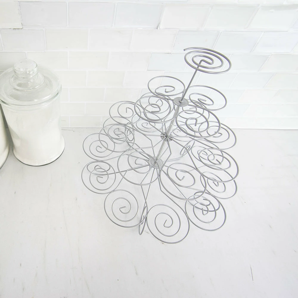 You’ve wowed your friends and family with your ability to whip up the most decadent desserts and you’ll wow them even more when you showcase your selection of delicious baked treats on this elegant 3 tier steel cupcake stand. Chit chat will quickly spiral the moment you let the intricate metal springs of this cupcake holder cradle your batch of your favorite desserts. The multi-level design lavishly displays up to 23 cupcakes and muffins. It easily assembles by twisting the rods in place. From birthdays to weddings and graduations, this 3 tiered cupcake stand will serve as the perfect centerpiece no matter the occasion.