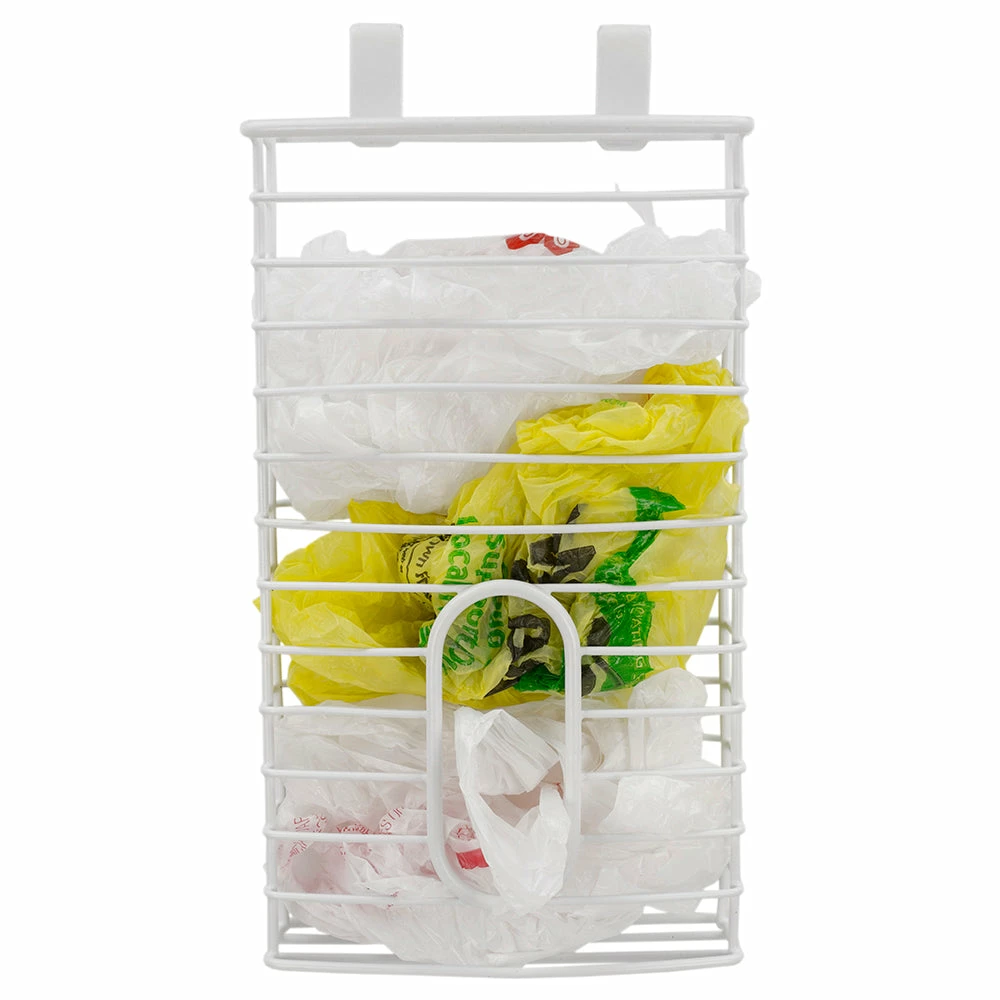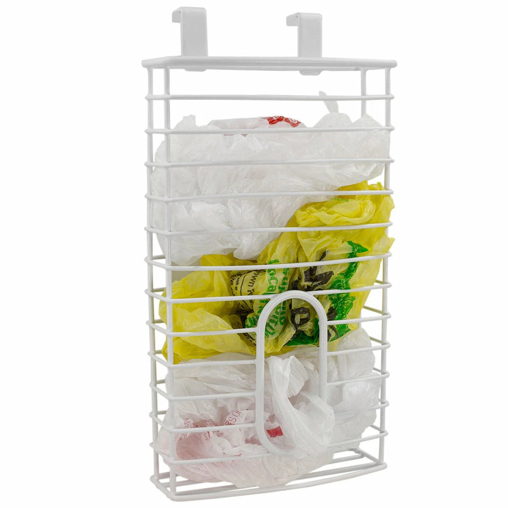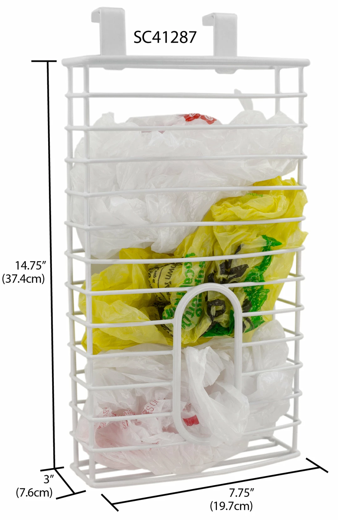 Say goodbye to the mangled mess of grocery and shopping bags that clutter up the inside of your cabinet, and invest in this over the cabinet organizer. Coming ready to hang, the back hooks fit snugly over the top edge of the cabinet door, while the soft foam backing keeps the doorโs surface protected from scratches. The open wire design provides slight transparency while still allowing for air to flow through to help minimize dust build-up. This large capacity plastic holder accommodates up to 50 plastic bags in one convenient easy- to-spot location. Load from the top and pull out a single bag from the cut-out at the front. Minimal assembly is required. Spot clean. Item dimensions may differ slightly due to the unique nature of the product. Color and finish may also differ from the images shown due to differences in monitor displays. Props and accessories are not included.