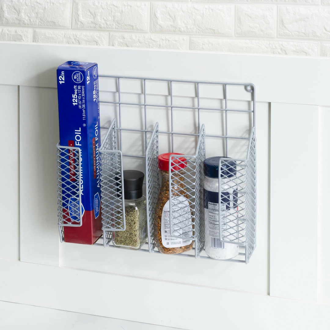 - DESIGNED TO LOVE AND LAST – Made of rust-proof vinyl coated steel, the organizer mounts on an interior cabinet door to maximize space. With four compartments you have plenty of space to organize foil, plastic, wrap and more.