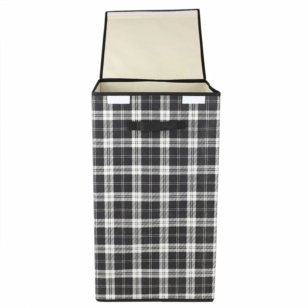 Conceal your worn clothes with this enclosed hamper. With a convenient touch fastener, the hamper secures the lid to the base, keeping your dirty laundry load out of sight and any odors from filling the air. Toss in your sweaty socks, jerseys, delicates and more within its spacious interior. The soft non-woven material is gentle and won’t snag your favorite clothes. The hamper also features a front handle allowing you to easily transport to the washer and back. To maximize space, the hamper is collapsible. It folds down flat, allowing you to store between a washer and dryer, underneath a bed, or tucked away neatly in a utility closet. If you need to use again, no worries. The hamper props up back into shape thanks to is flexible structure. Item dimensions may differ slightly due to the unique nature of the product. Color and finish may also differ from the images shown due to differences in monitor displays. Props and accessories are not included.