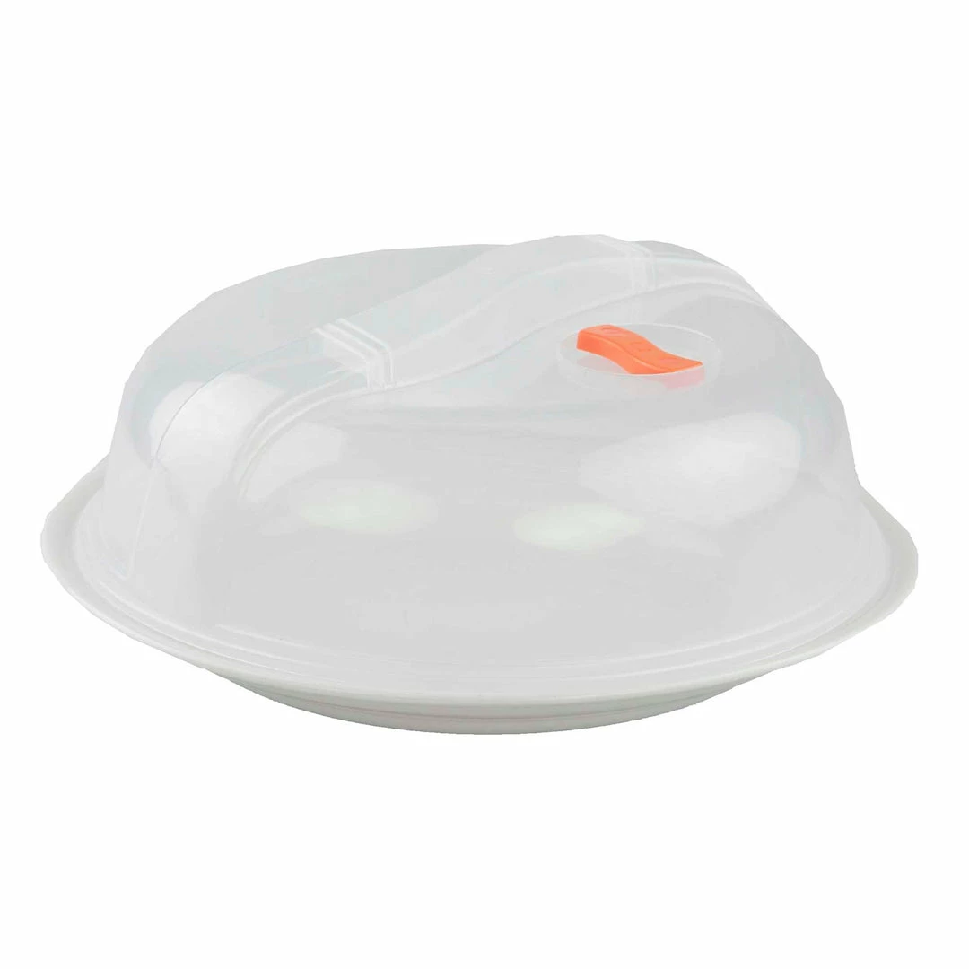Keep your microwave free of splatters with this microwave plate cover. Made from heavy duty plastic. Small vent at the top to let out steam when heating food. Fits on a 10 inch dinner plate.