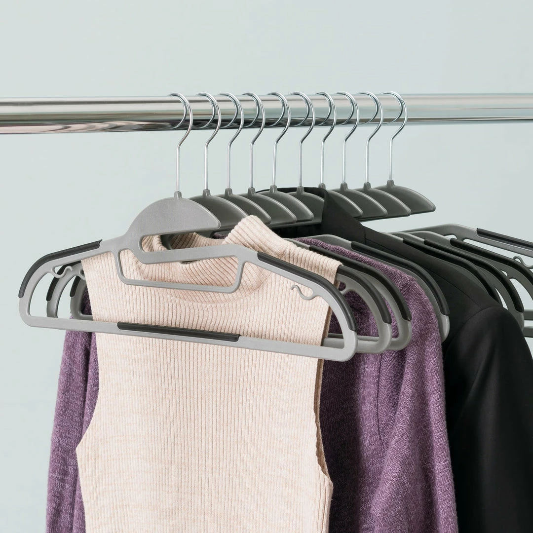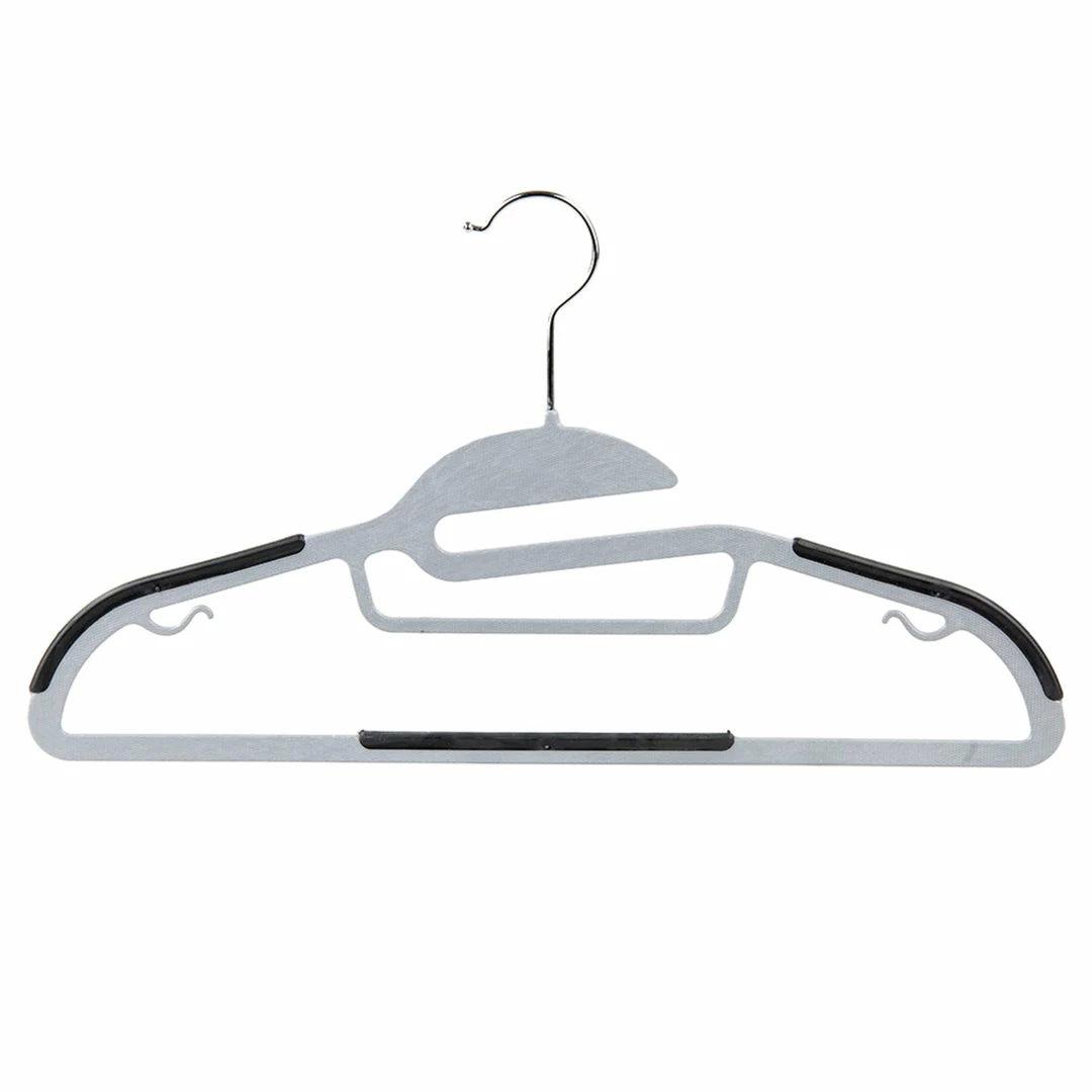 Keep your clothes off the floor using this non-slip hanger. Made of heavy duty plastic. It features small indents for clothes with small straps. Measures 15.75โ x 9.25โ x 3.25โ.