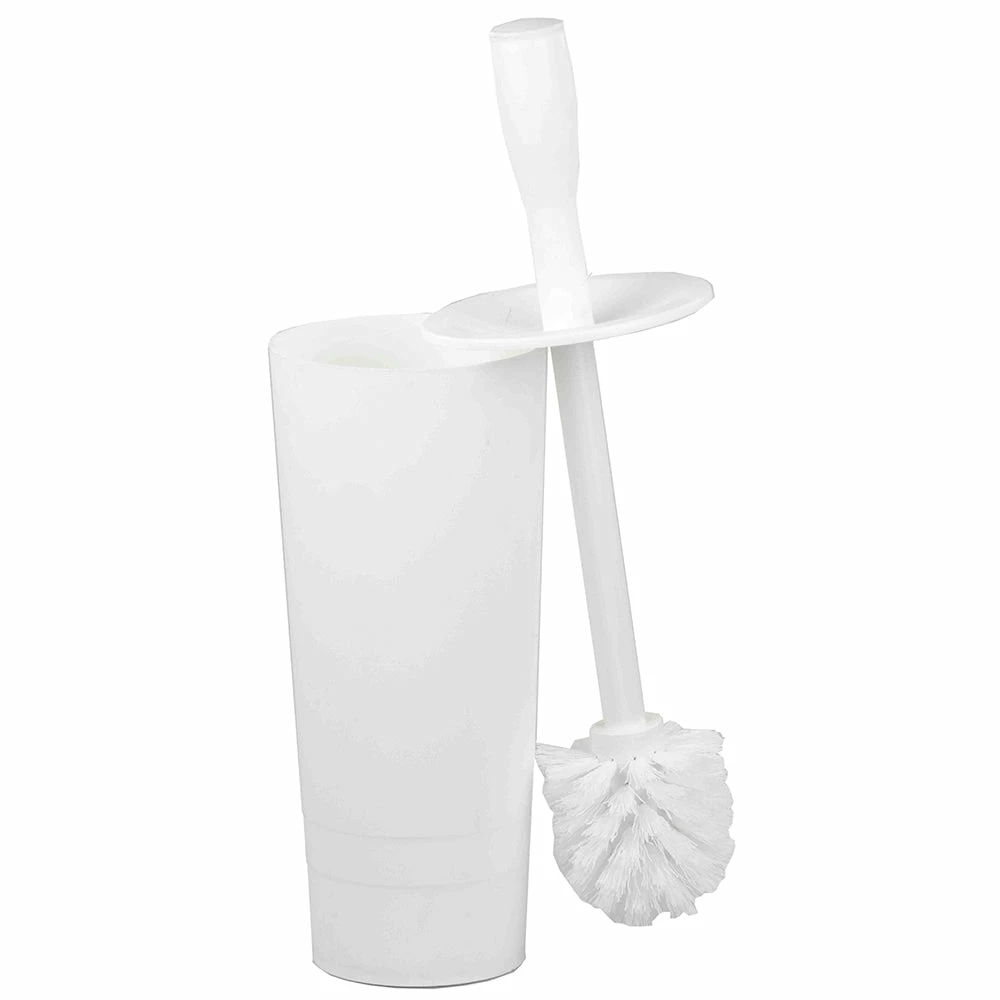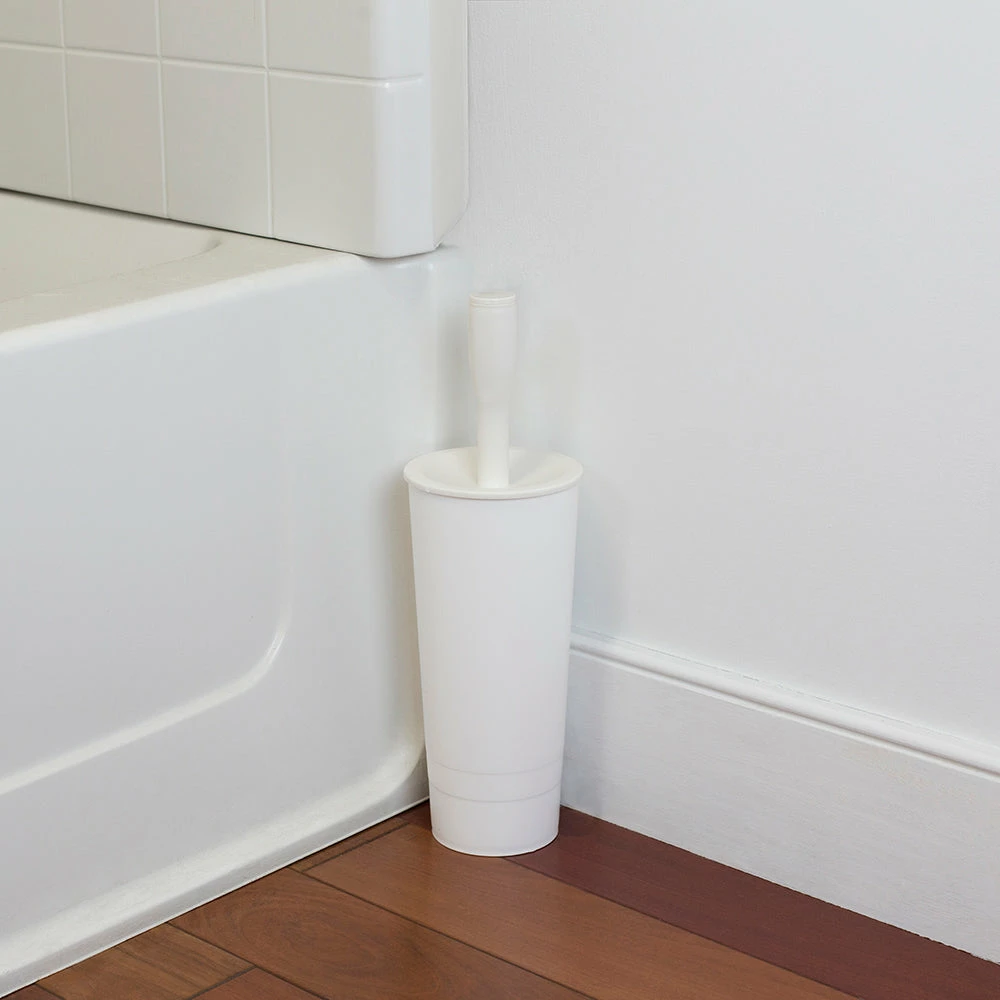 Timeless form with impeccable function, this classic toilet brush holder set makes an ordinary and bathroom cleaning tool into a decorative bath accessory. The tapered brush head is equipped with stiff bristles that gently swipe dirt and grime in and around the toilet bowl. The handle is long to achieve maximum reach with a disc in the center to prevent splashing on yourself as your are cleaning. When placed in the container, the brush is completely hidden for elegant storage. The sleek profile of this toilet brush canister makes it perfect if you reside in tight quarters such as small apartments, condos or dorm rooms. Hand wash to clean.