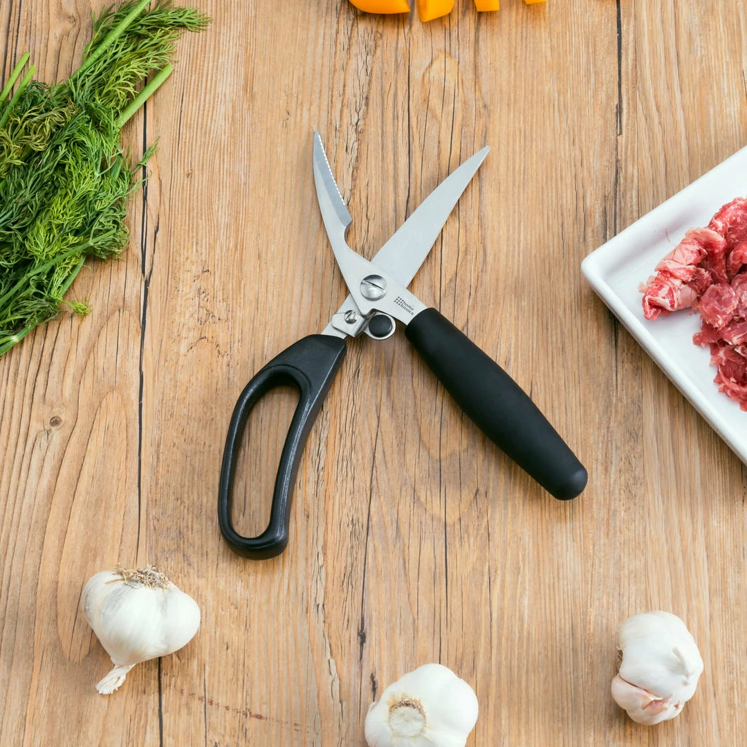 - Multi-purpose kitchen shears with razor sharp stainless steel blades precisely cut and trim poultry, fish meat, leafy herbs, and more