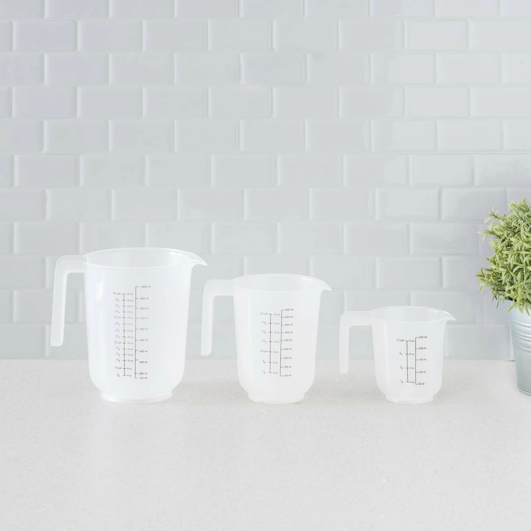 - DESIGNED TO LOVE AND LAST – Made of durable, break-resistant plastic, this set of measuring cups are designed to meet all your measuring tasks for years to come. These measuring cups are lightweight for easy lifting with durable and smooth handles for comfortable pouring. With 3 sizes and a precise measuring guide you can portion out the amount for all your baking, cooking, and grilling needs.