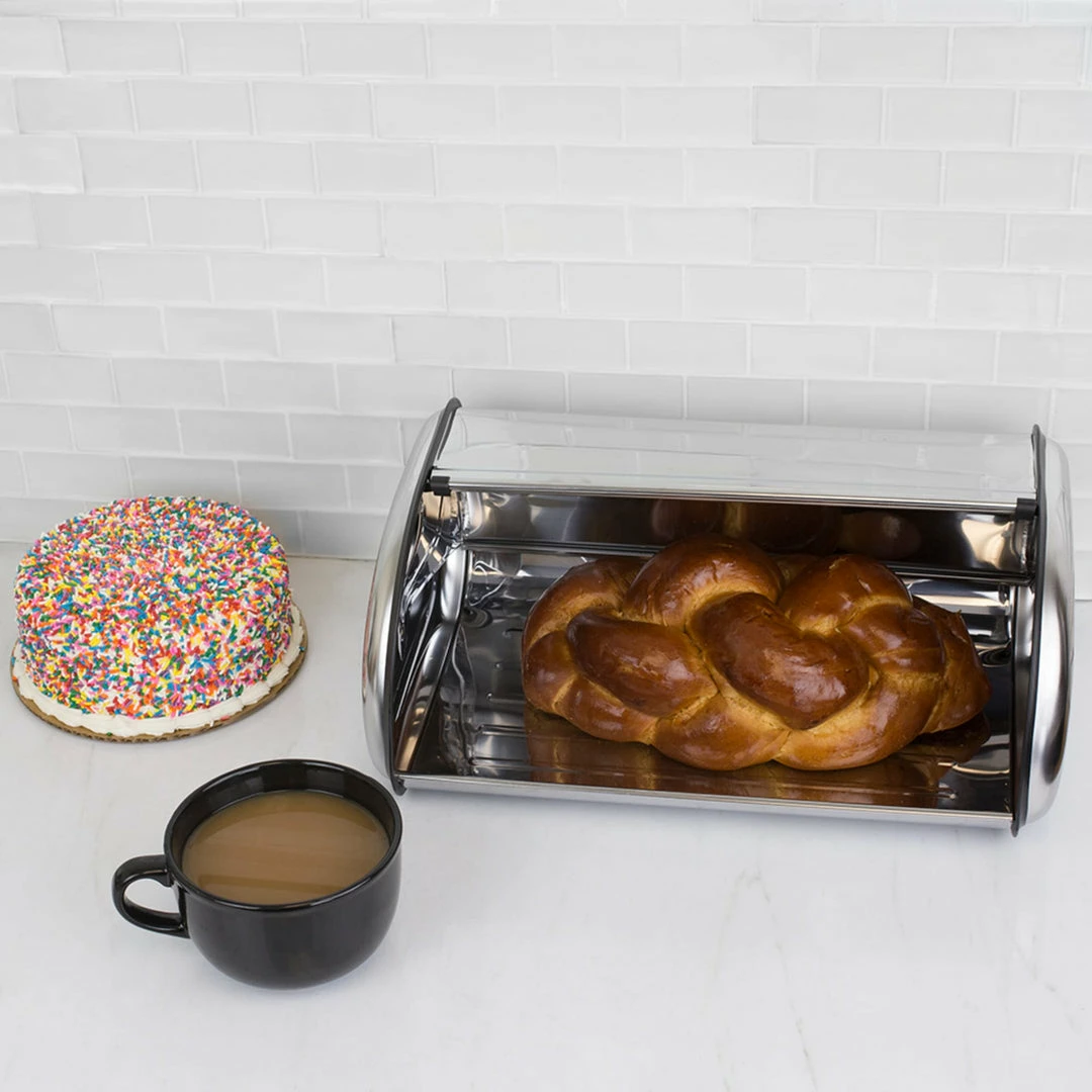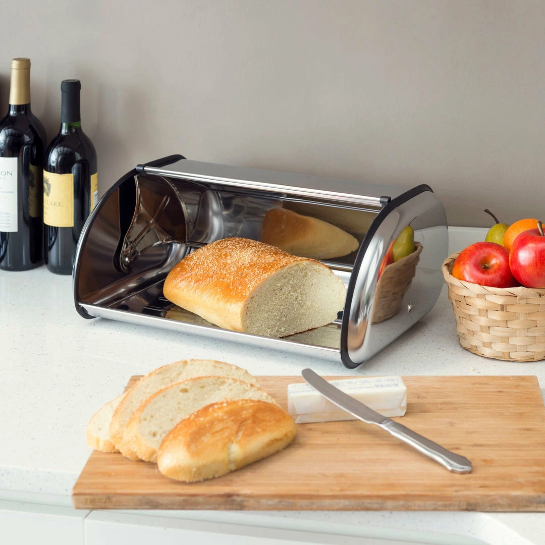 - COUNTER-TOP SPACE SAVER – A lighter and sleeker alternative to traditional wood bread boxes, our line of roll-top bread bins rests squarely on the countertop, taking little room and offers a roll-top door that retracts smoothly and closes tightly.