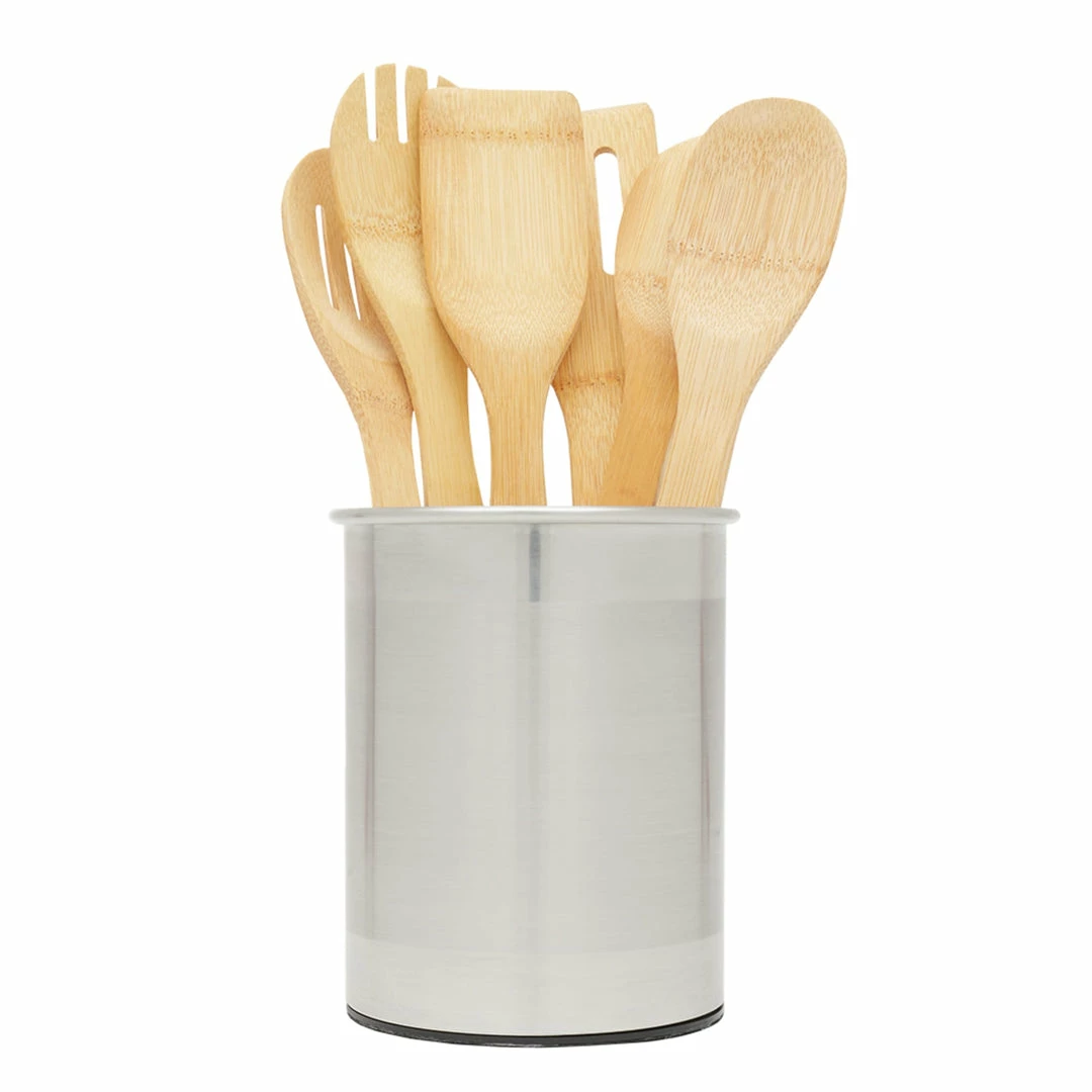 Rotating around and around, find all your necessary kitchen tools with this smooth spinning utensil holder. This roomy rotating utensil spins a full 360 degrees so you can easily grab what you need without having to lift and peek inside the container. Organize everything from stirring and dipping spoons, whisks, and spatulas . It will keep it all steady, upright and at the ready for your next recipe. Beyond providing a good hold on your tools and utensils, it makes for a perfect for beautiful contemporary vase for an arrangement of fresh florals. Or use as a desktop organizer to keep pens, pencils, and other writing implements within your fingertips. Wipe the surface with a damp cloth. Dry thoroughly. Item dimensions may differ slightly due to the unique nature of the product. Color and finish may also differ from the images shown due to differences in monitor displays. Props and accessories are not included.