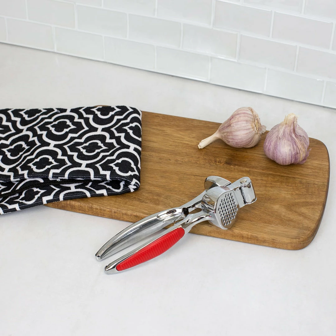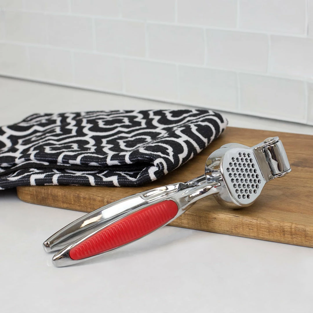 - TEXTURED RUBBER GRIP HANDLES FOR A COMFORTABLE AND SOLID HOLD – The zinc plated steel handle with rubberized grips provides just the perfect amount of torque to crush garlic cloves, while still maintaining a non-slip grip even when hands are damp and sticky.