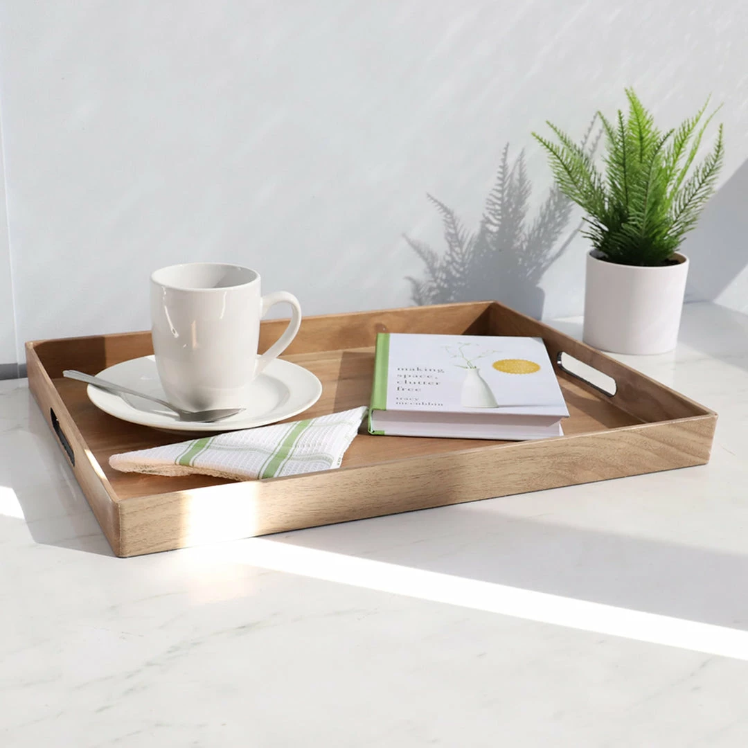 From indulging in a lazy breakfast in bed on a Sunday to serving a delicious and colorful spread of appetizers at your next party, you’ll sure find this tray to be a great addition to add to your home. With its wood-like look, it will make add a natural touch to a variety of displays. The low profile design of this serving tray with cut-out handles along both sides it will make transporting a full load of items from one location to the next a snap. It features tall walls preventing items from slipping through. Wipe the surface with a clean cloth to maintain its beautiful finish. Item dimensions may differ slightly due to the unique nature of the product. Color and finish may also differ from the images shown due to differences in monitor displays. Props and accessories are not included.