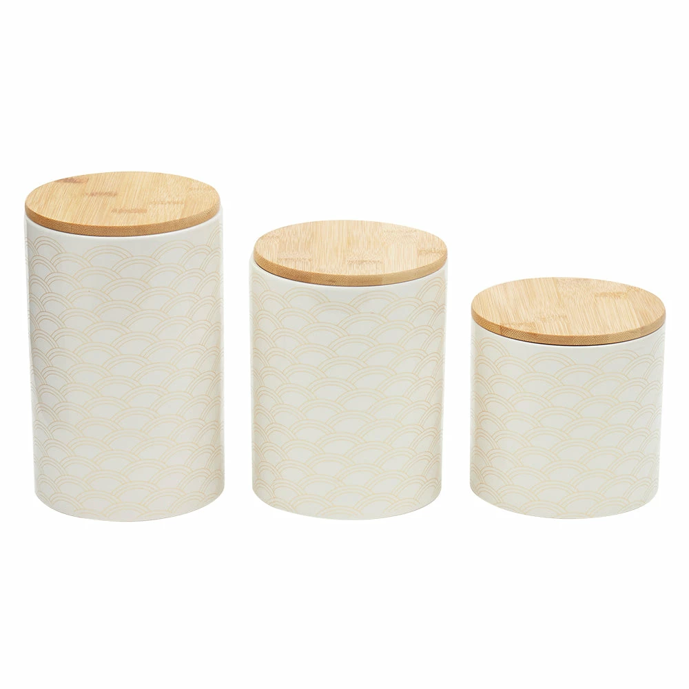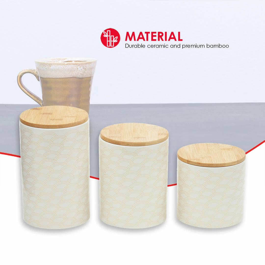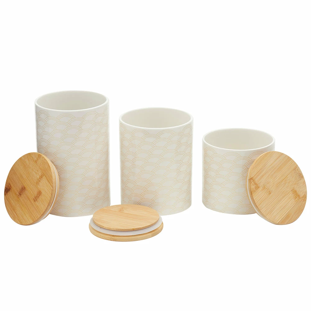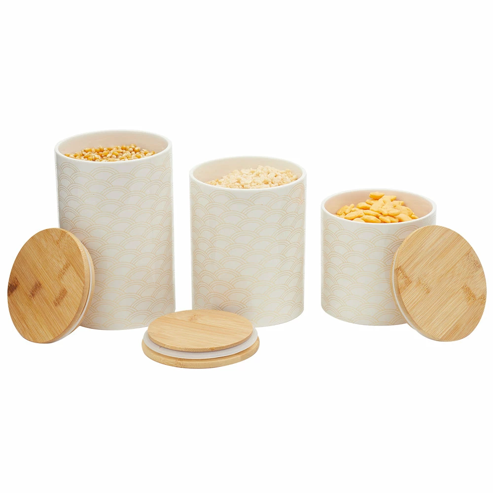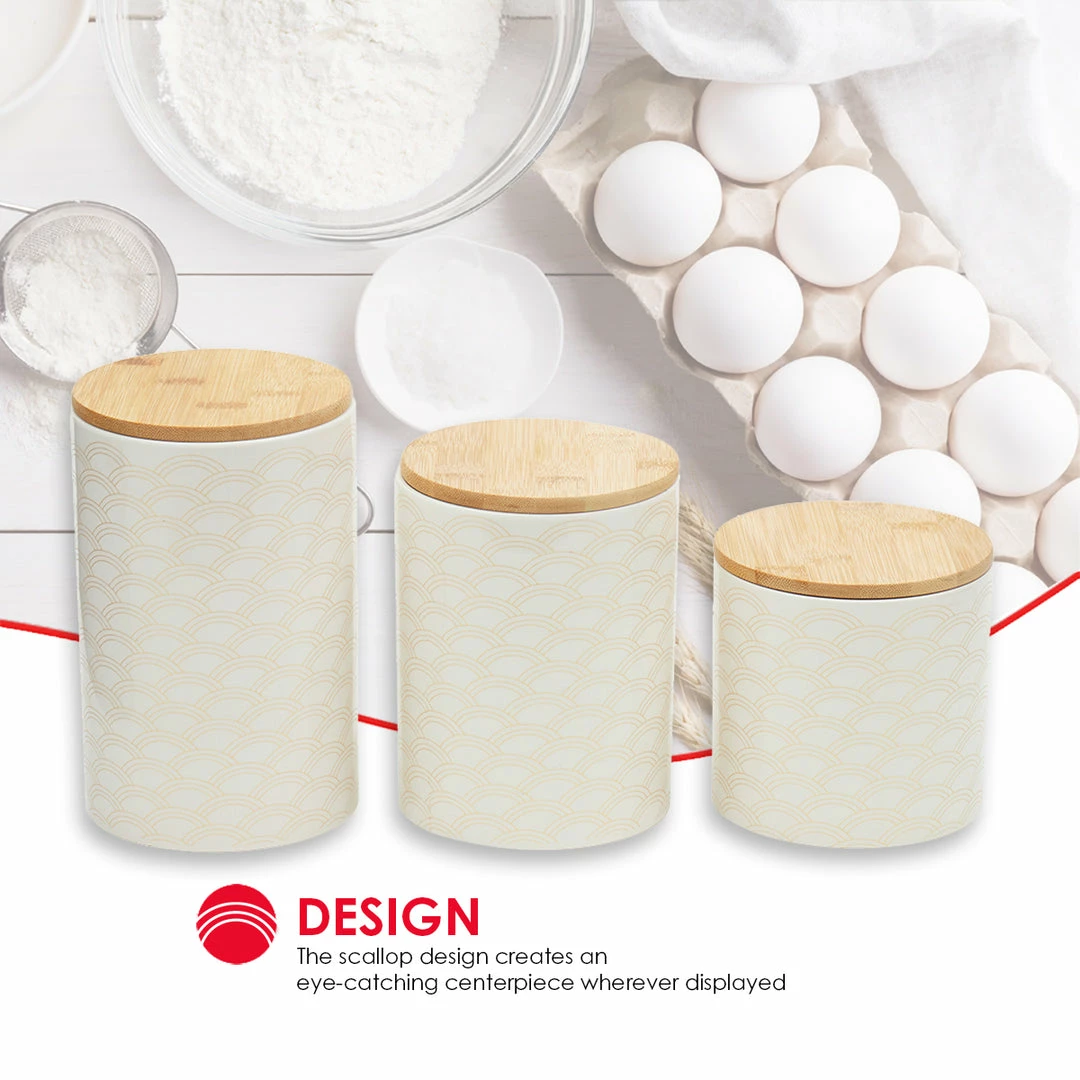From pasta, flour, and spices, to tea and coffee keep all your favorite pantry staples fresh and flavorful with this set of canisters. The scallop design is eye-appealing, while its smooth finish makes it easy to wipe clean. The lids are made from bamboo, with silicone seals underneath to preserve freshness and keep your contents secure. Show them off on the kitchen counter, or they can easily all fit in the pantry or cabinet. A must-have for any kitchen, they contrast any type of interior dรฉcor. Use not only for storing food, but to place makeup, cue tips, stationary, jewelry, and more. Hand wash to clean. Item dimensions may differ slightly due to the unique nature of the product. Color and finish may also differ from the images shown due to differences in monitor displays. Props and accessories are not included.