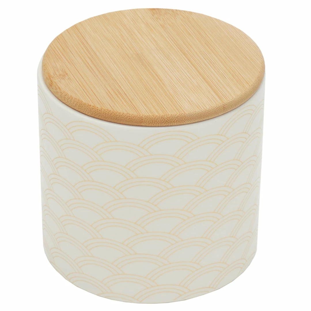 Preserve and store all your favorite dried foods longer. Great for coffee beans, sugar, salt and pepper. Topped with a bamboo lid that lift off for ease of use. No difficult latches or clasp to have to unlock, making it super easy to get what you need when youโre in a hurry. Great as decorative container. Display on the countertop, dresser, or table. Use during the holidays as seasonal countertop dรฉcor. Place on vanities and shelves for even more stylish bath storage. With its beautiful design it will add visual appeal to any setting and also help hide any clutter. Great as gift for friends and family. Store in a dry environment. Wipe the surface with a clean cloth. Item dimensions may differ slightly due to the unique nature of the product. Color and finish may also differ form the images shown due to differences in monitor displays. Props and accessories are not included.