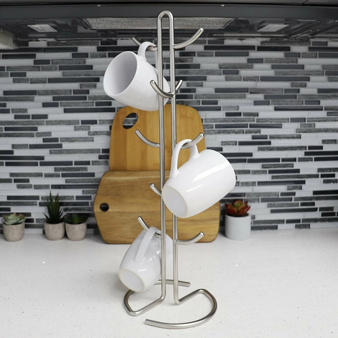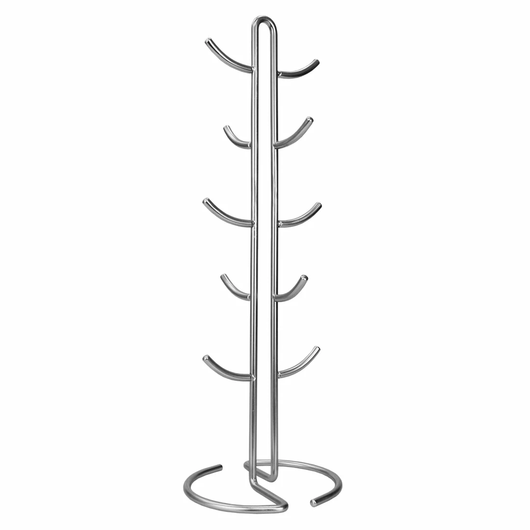 Clear up cupboard space by displaying your collection of cups with the jumbo mug stand. The holder can hold up to 10 cups. With each branch tilting upwards, each mug stays securely in place. A solid steel base keeps the stand steady and even on the table. The modern and clean design makes it perfect for matching existing dรฉcor. Beyond providing convenient storage for extra mugs, it also works equally well as a jewelry rack where you can organize all your necklaces, bracelet, and other small accessories. A looped center post makes easy to move from counter to table and back when needed. If youโre looking for a mug tree to decorate your countertop while simultaneously keeping your favorite mugs close at hand, this is it! Item dimensions may differ slightly due to the unique nature of the product. Color and finish may also differ from the images shown due to differences in monitor displays. Props and accessories are not included.