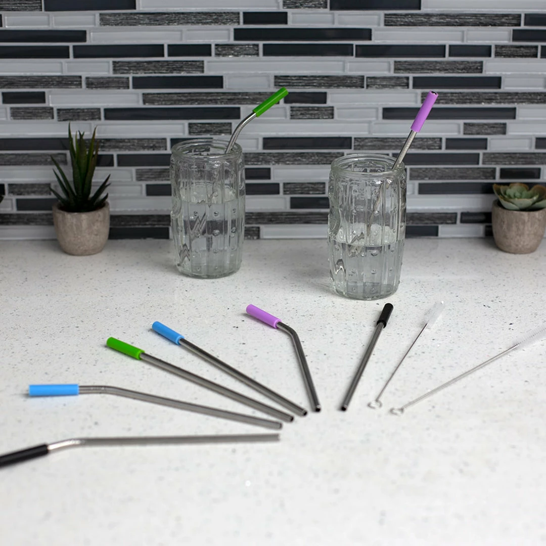Discard the disposable plastic straws that add to the pollution and water waste. Sip your beverages using these reusable and environmentally friendly drinking straws. Each straw is made of highly durable stainless steel with soft silicone sleeves that won’t hurt your teeth or lips when in contact. With a combination of both bent and straight straws in various sizes, this set makes it easy to drink in any beverage vessel whether it’s that travel mug holding your morning coffee or that tumbler carrying your little one’s mid-afternoon The set also comes complete with a versatile cleaning brush that can be used to clean the straws within the set or used to clean bottles and cups.