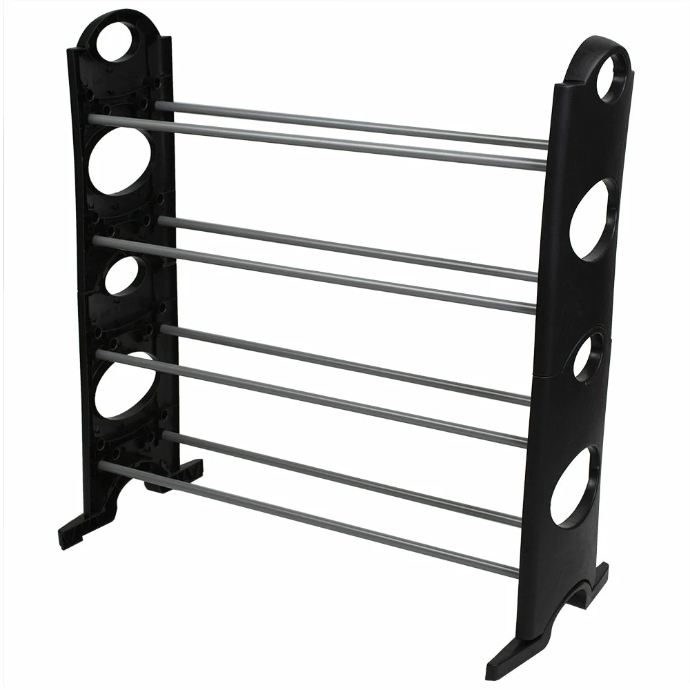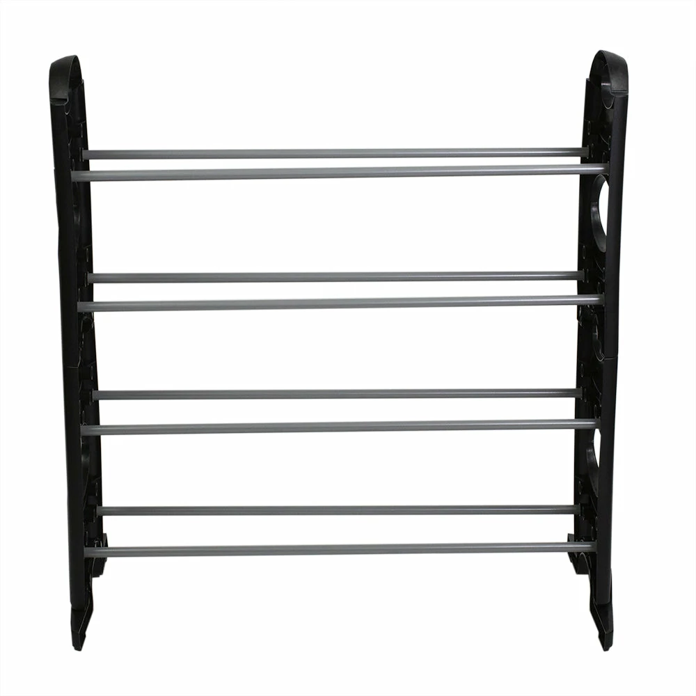 Designed with high strength metal rods and sturdy plastic attachments this tiered free standing shoe rack can accommodate up to 12 pairs of shoes. Varying size holes on each side allow to adjust the distance between shelf to accommodate different types and sizes of shoes. The open style shelving allows you to see your collection in a quick glance, while also keeping your shoes well-ventilated. Step, by instructions included for quick set up right out of the box. Spot clean.