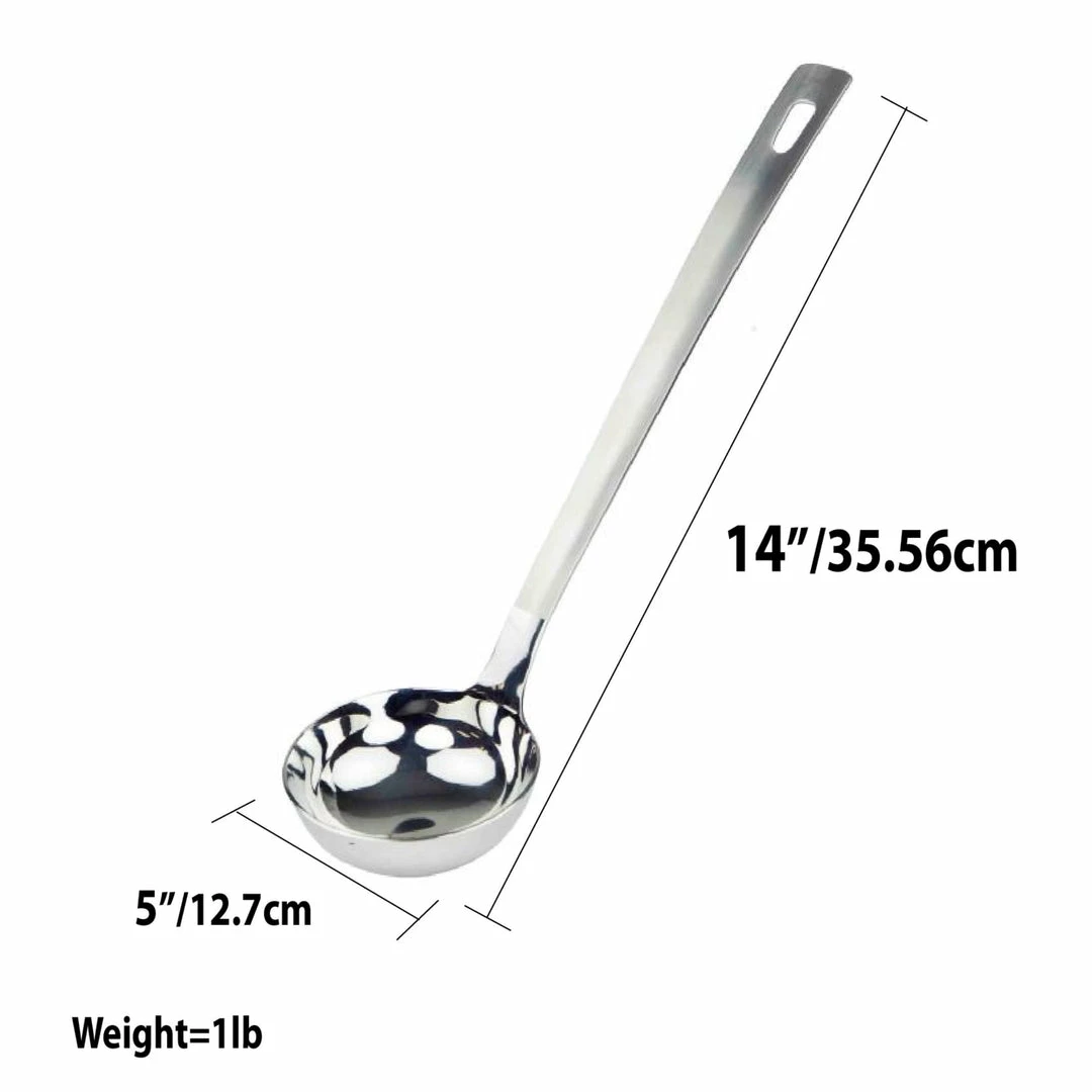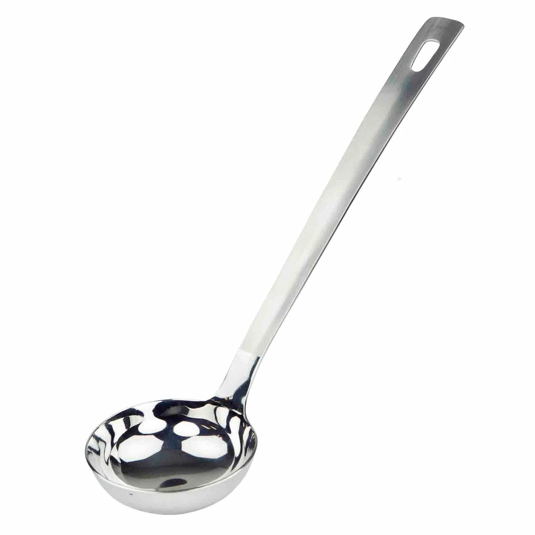 Perfectly sized for serving food and for mixing and stirring, this ladle features a deep bowl and a contoured handle for smooth pouring. The mirrored finish and silver hue coordinates seamlessly with any styled kitchen and appliance. Small opening is located along the handle to make it easy to store on a rack for easy compact, storage. ldeal to use on virtually all types of cookware and bakeware.