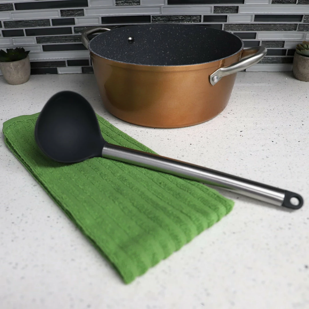 Perfectly sized for serving food and for mixing and stirring, this ladle features a deep bowl for gathering up a huge portion. Hanging hole in handle for easy storage. Hand wash. Non-scratch silicone finish prevents scratches on delicate cookware and bakeware