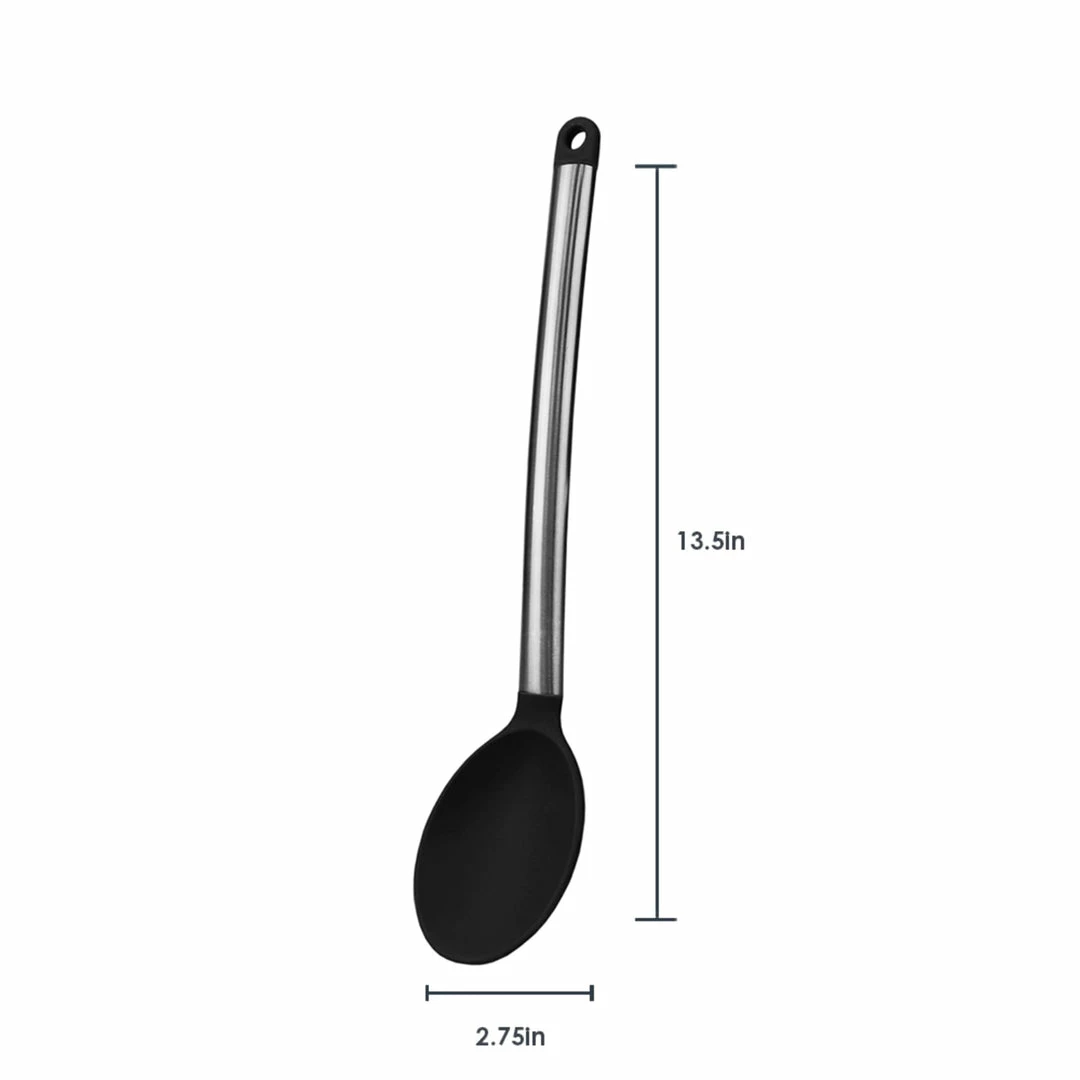 From serving stew, basting to stirring and mixing sauces, this nylon solid spoon with silicone handles is handy to keep in your cooking arsenal. The nylon material is safe to use virtually on any bakeware or cookware, including non-stick. A shallow bowl makes it incredibly useful to collect a decent portion of your culinary creation for tasting. The long handle has a hole on the top for easier hanging on cabinets or racks to store away when not in use.
